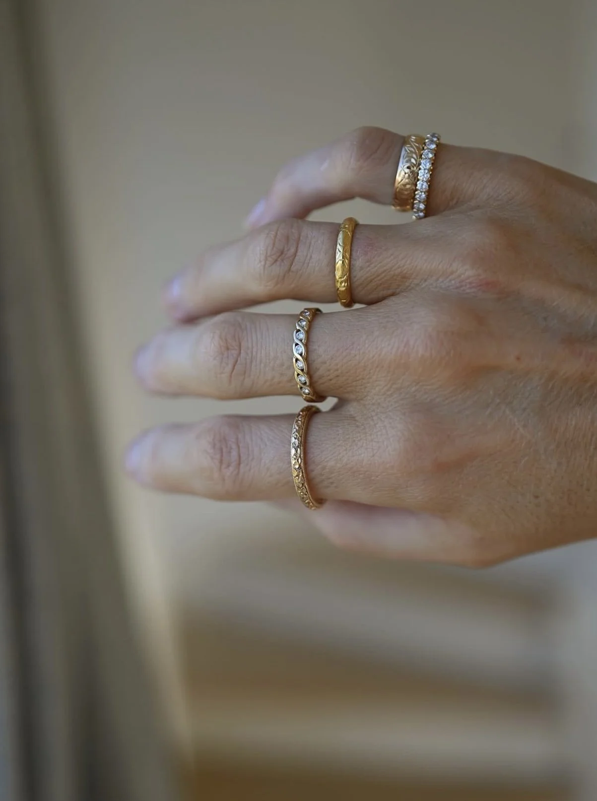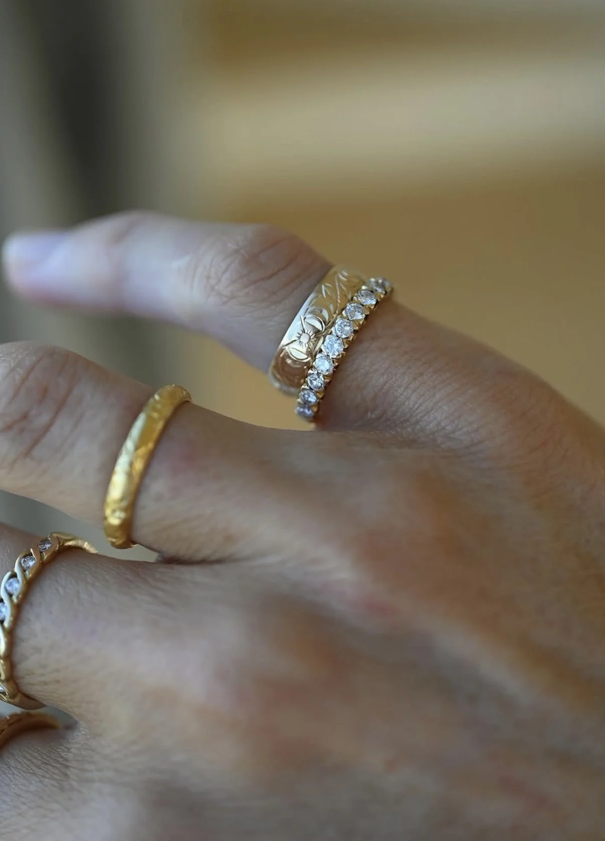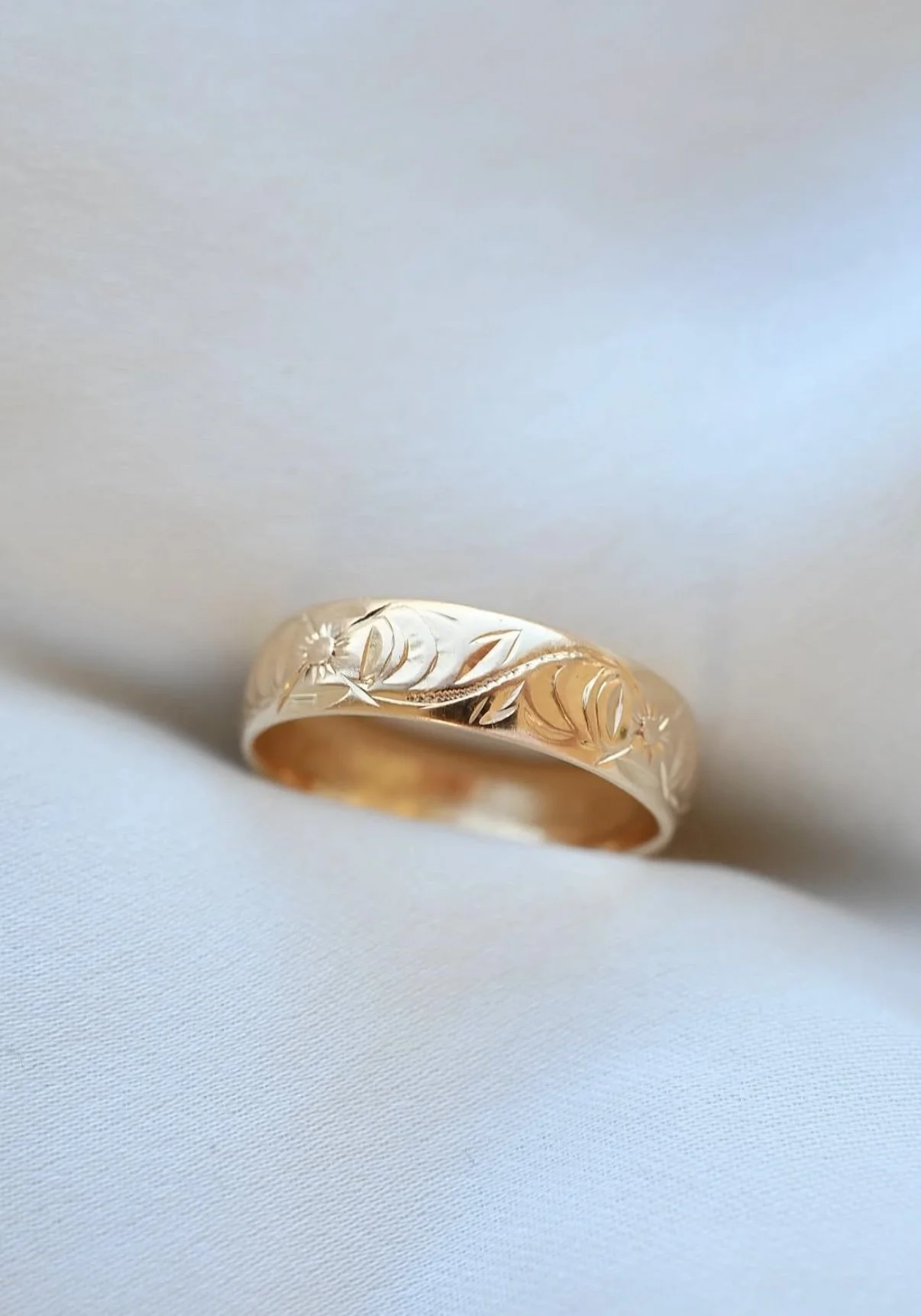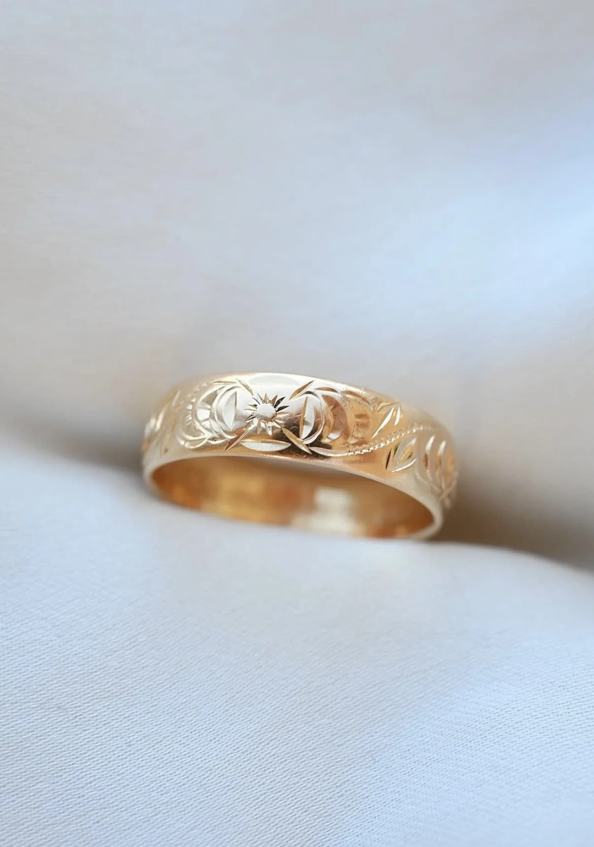New in! Romantic Sun and Leaf Engraved Wide Antique Band 18K Gold