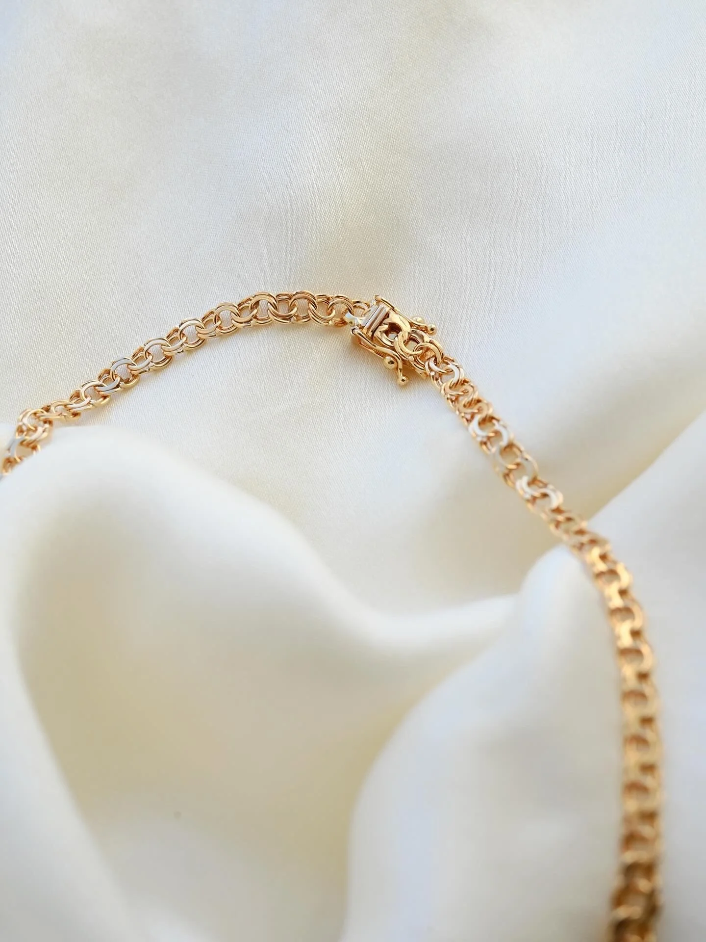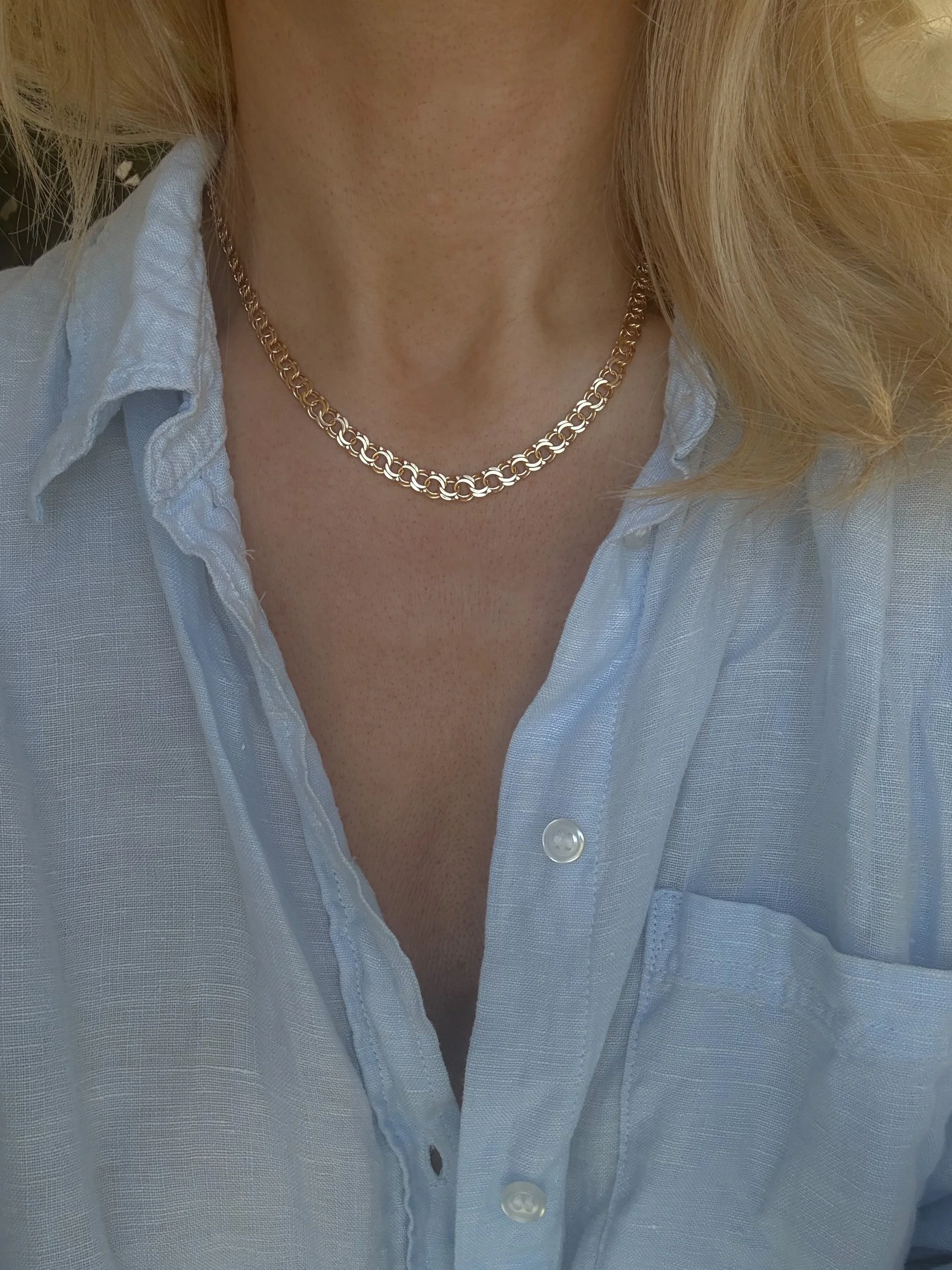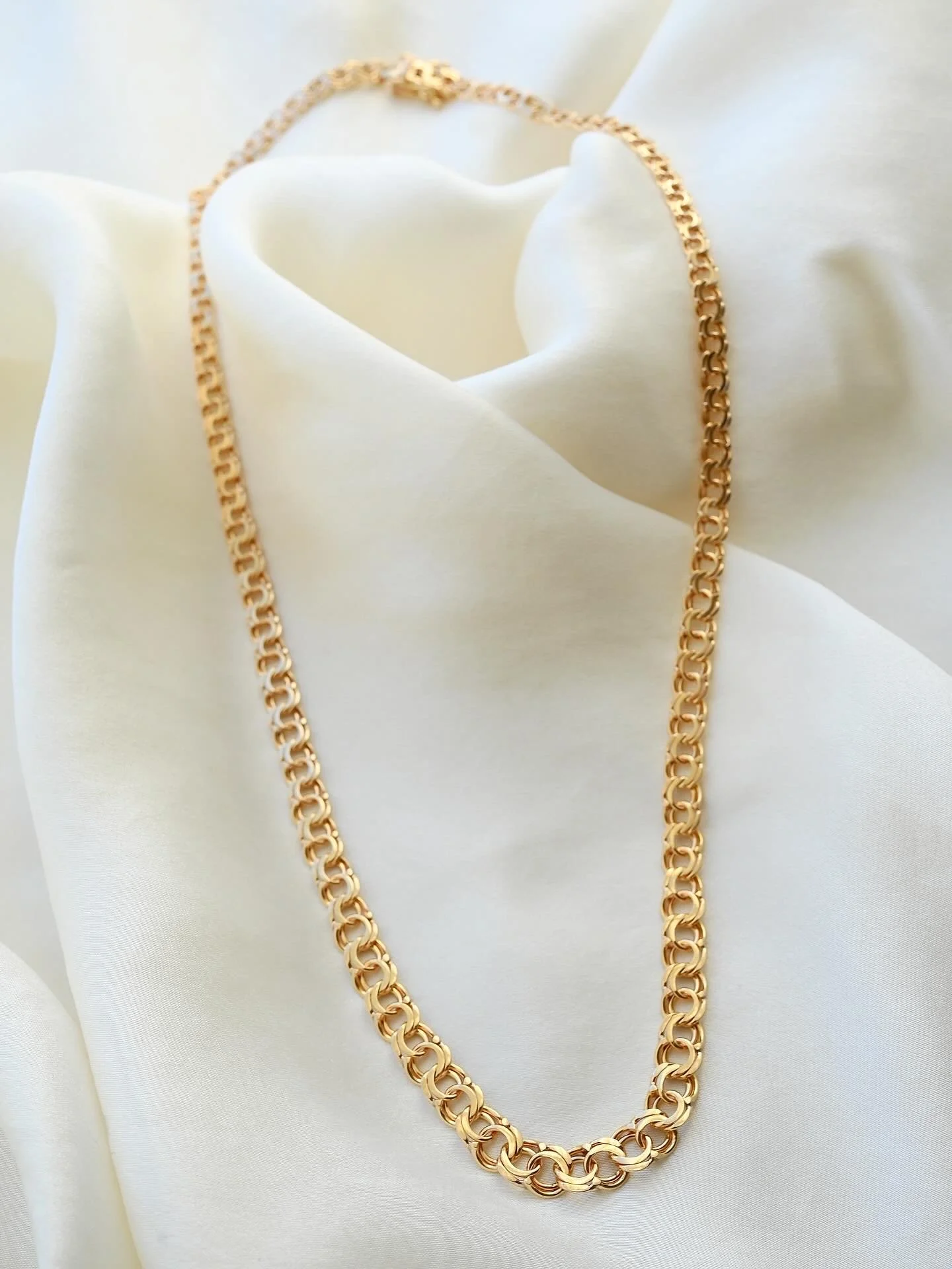 She’s a chunky delight in rich 18K gold, with a Bismarck-link design that moves with soft, silky fluidity. There’s something hypnotic about the way her interlocking links catch the light with every movement. She sits at a perfect 17.3 inches. Bold, tactile, and endlessly satisfying to wear.
