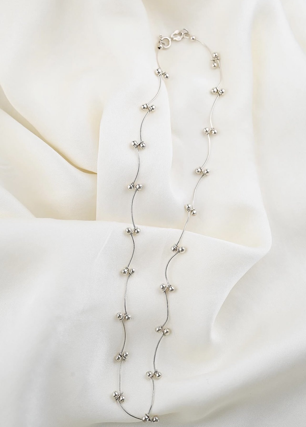 A vintage silver necklace with the most charming, organic flow. Softly curved links create this gentle wave around the neckline, each adorned with tiny silver beads that add just enough detail and movement. There’s something so light and feminine about her… playful, a little romantic, and completely unique.