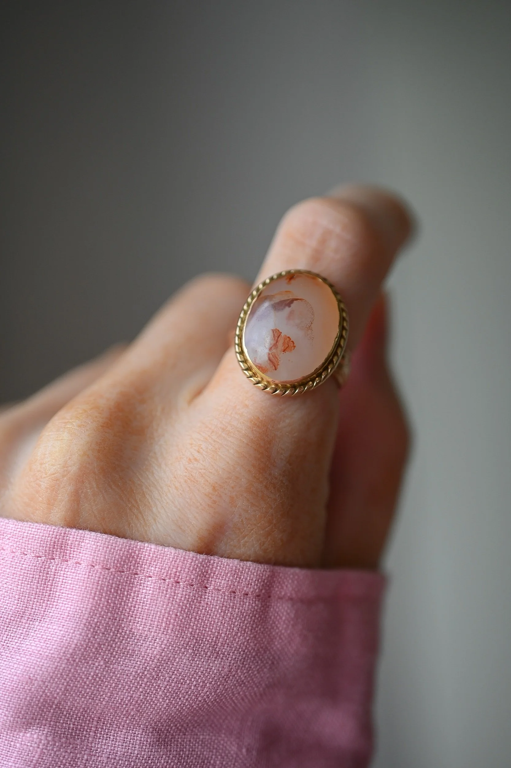 And that stone; a cabochon-cut agate with painterly warmth and movement, like a misty desert bloom or a dreamy landscape at golden hour. The tones inside echo the blush of the rose gold and the richness of the yellow gold perfectly.