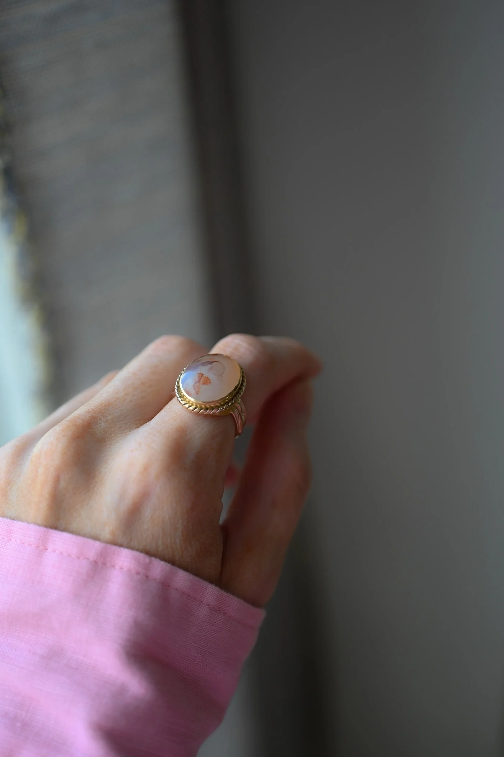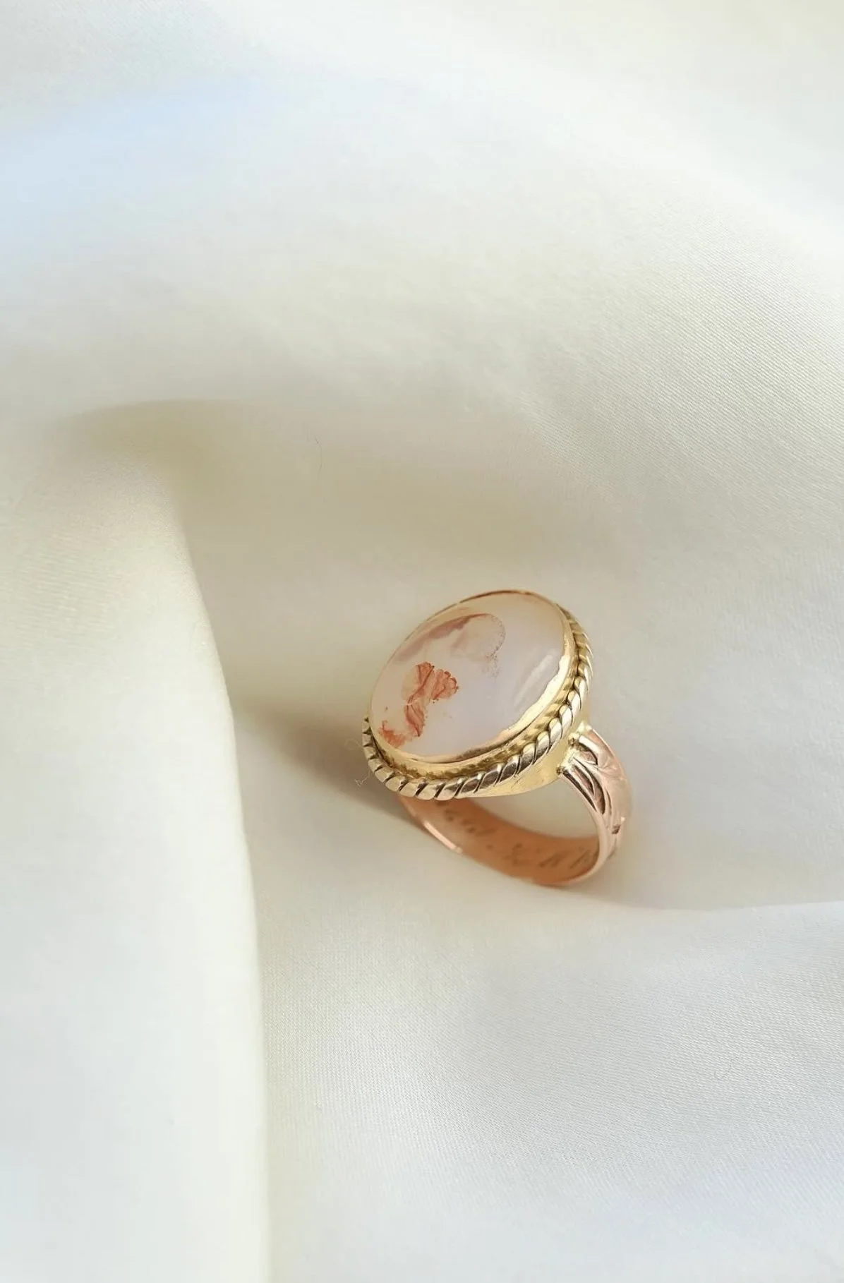She’s from 1918, and you can feel it in every detail. This extraordinary antique ring carries over a century of history in her graceful bones, crafted in lush 14k two-tone gold with a soft rose gold band that wraps around your finger like a warm whisper. The delicate rope border is in yellow gold, giving her that rare, subtle contrast that somehow makes the colors of the agate sing even more deeply.