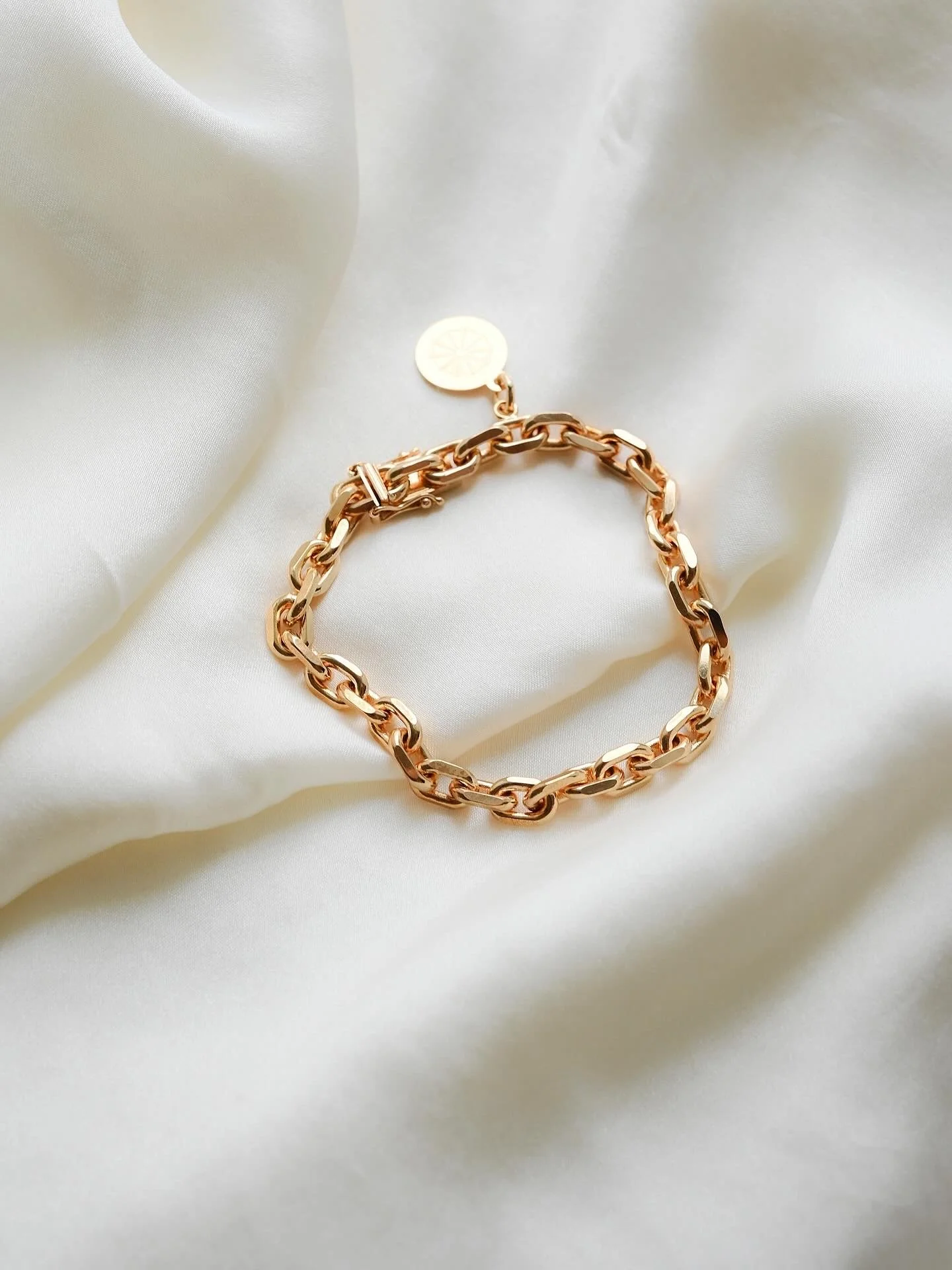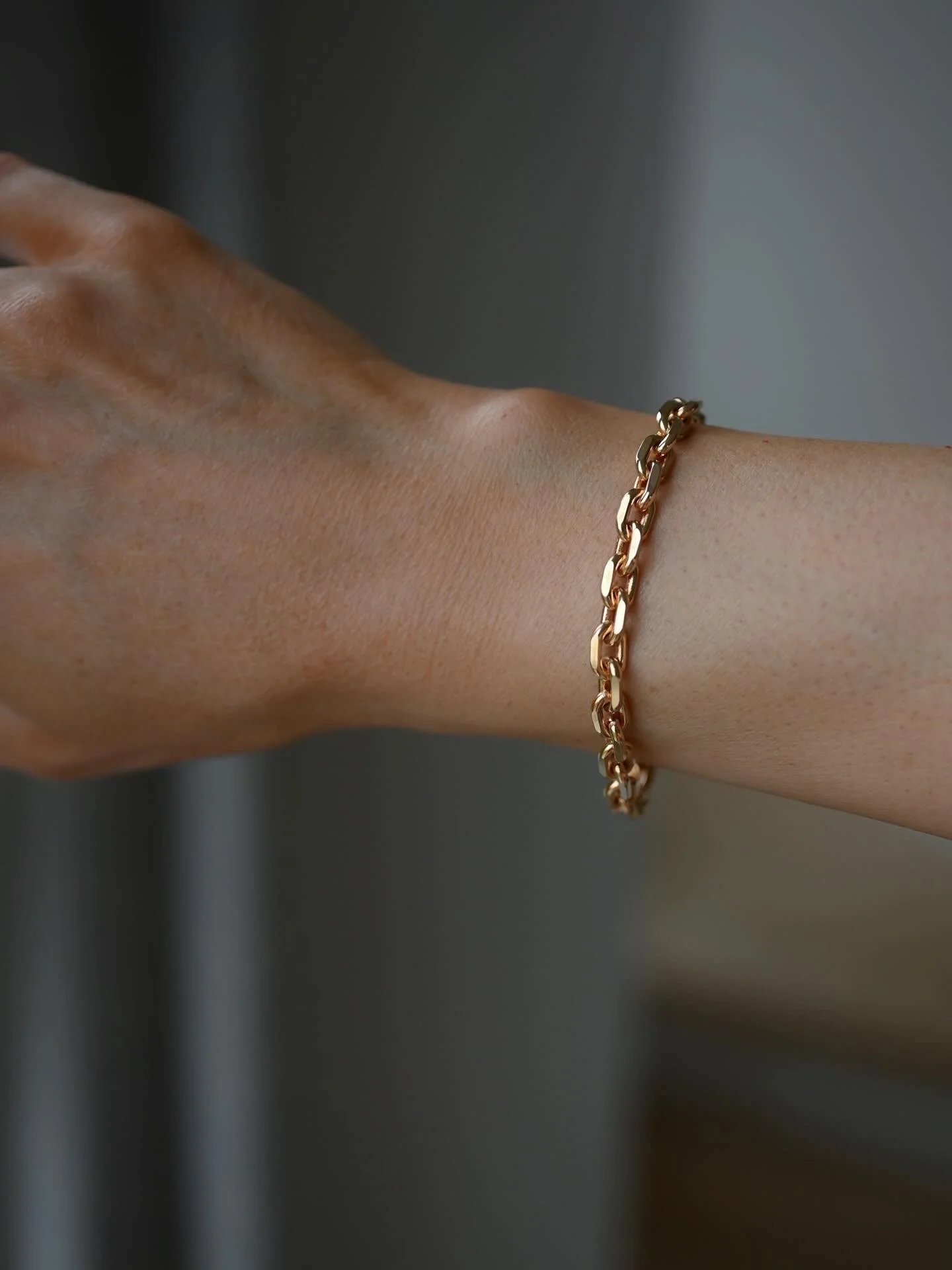 She has a gorgeous weight and movement, her thick links sliding across the wrist like satin. At 7.25 inches in total length and with an inside circumference of 6.5 inches, she drapes perfectly and feels substantial without ever being bulky. The secure box clasp closes with a crisp click and includes a double safety for extra peace of mind.