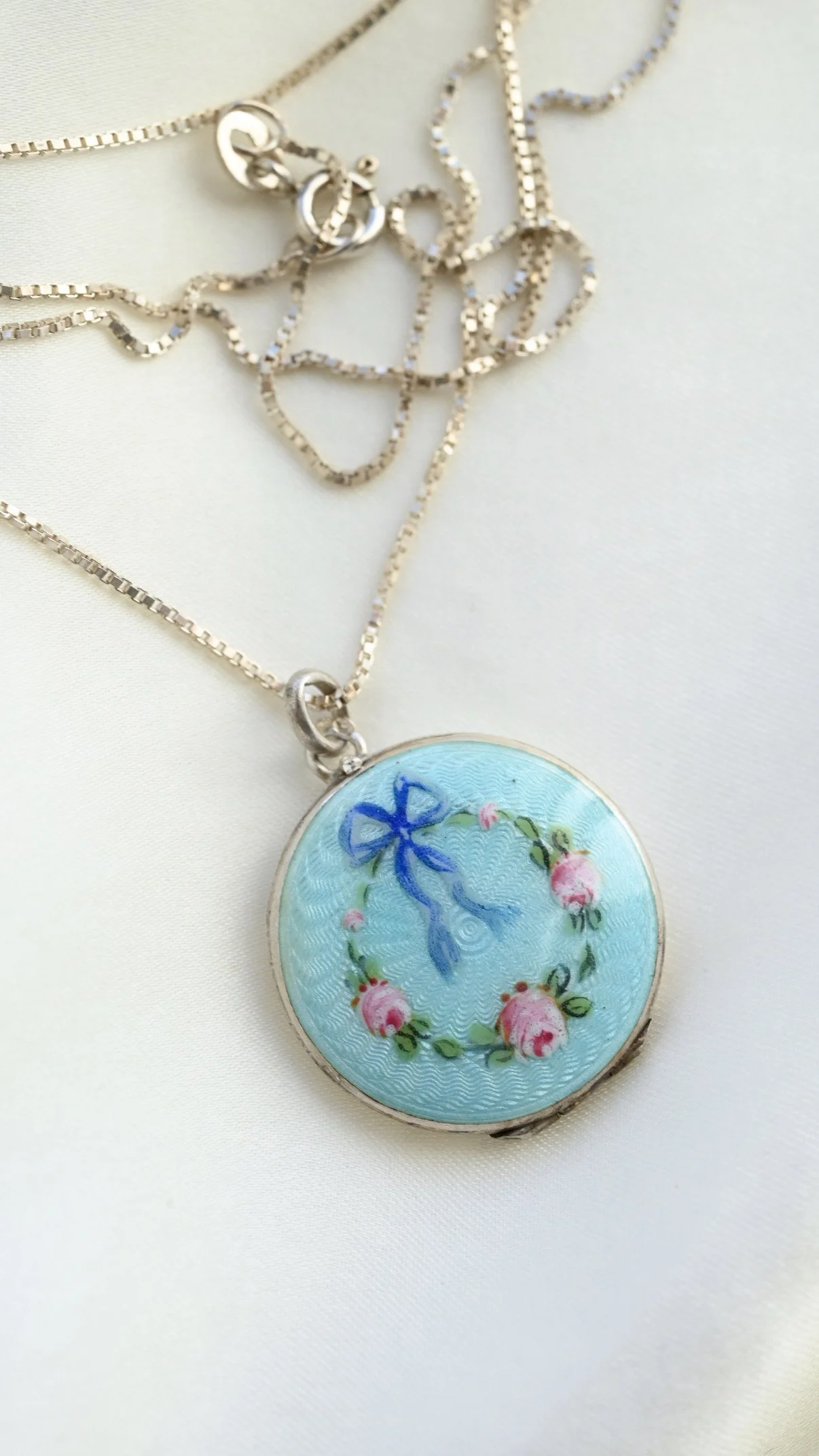 She is an absolute pastel dream. A delicate silver locket from the late 1800s, wrapped in the softest powder blue guilloché enamel and adorned with a hand-painted wreath of pink roses tied up with a little blue bow. The fine wave-like pattern under the enamel gives her a glow that changes with the light, and that dainty floral motif is so charming it could melt anyone’s heart.