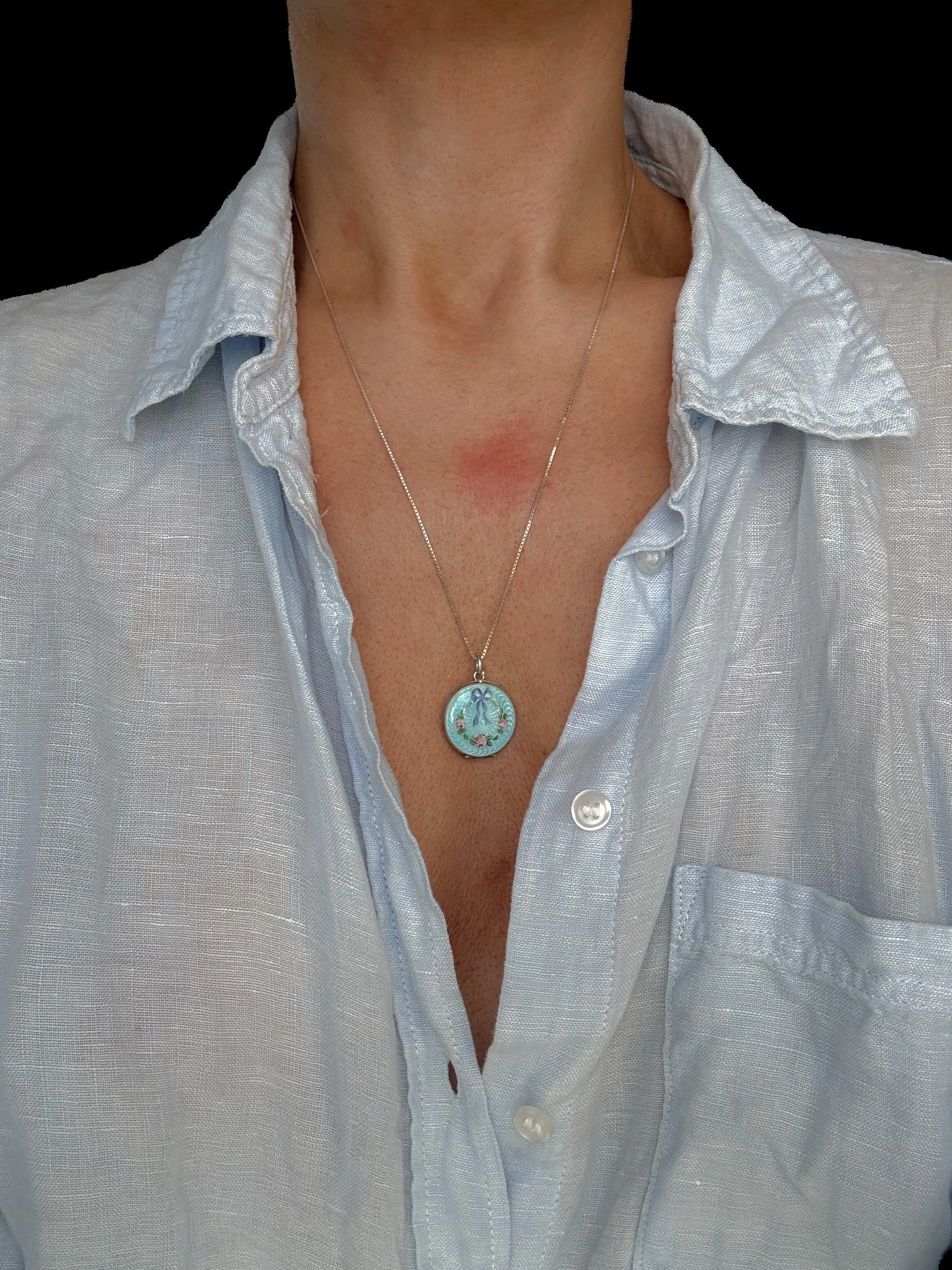 Her enamel is in wonderful condition, and the closure clicks securely into place with a satisfying little snap. She comes on a matching silver chain, ready to wear and cherish. Measuring just under 1.25 inches, she’s a smaller piece with a ton of character, like a miniature storybook worn at your heart.