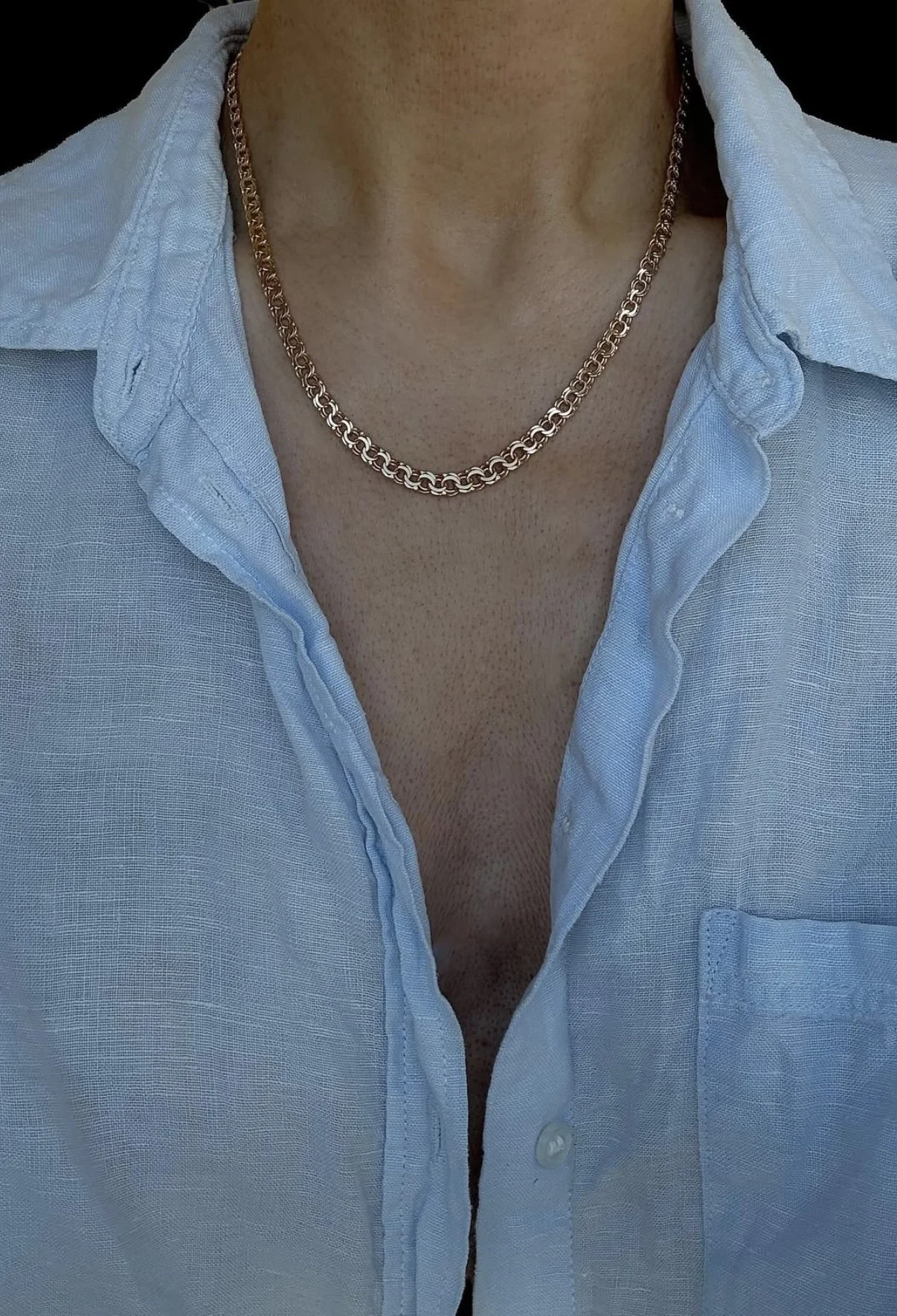And this one… she is exactly that. An absolute dream of an 18K gold beauty, built with those rounded interlocking links that give her that soft, glossy rhythm as she moves. She feels wonderfully substantial, weighing approximately 16.5 grams, and she sits at that perfect 18-inch length, right where she frames the collarbone with quiet confidence.