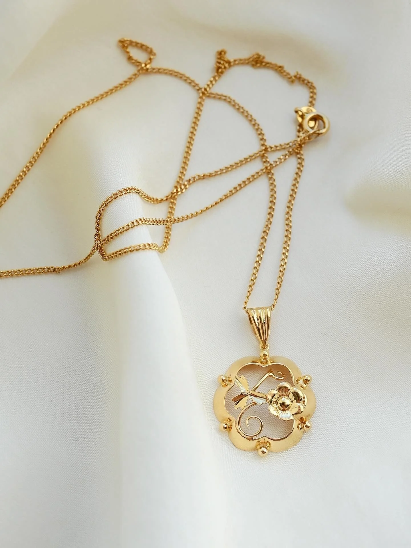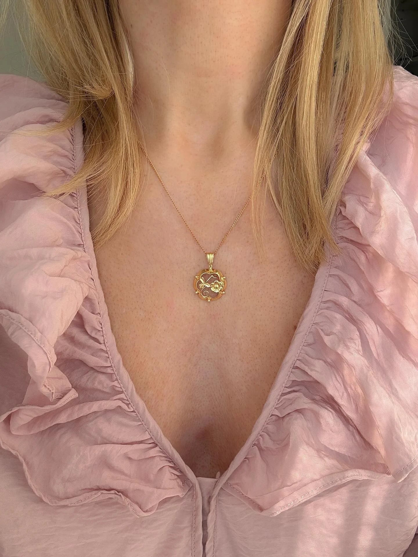 She is joy in necklace form! A swirling, flower-filled celebration in 18k gold, with a gentle, romantic spirit that feels like spring caught in a pendant. At the center, a delicate dragonfly flutters toward a softly blooming flower, all framed by a scalloped golden border dotted with polished spheres for that playful vintage touch. The way this piece catches the light is nothing short of magical, with gleaming highlights bouncing from every curve and corner.