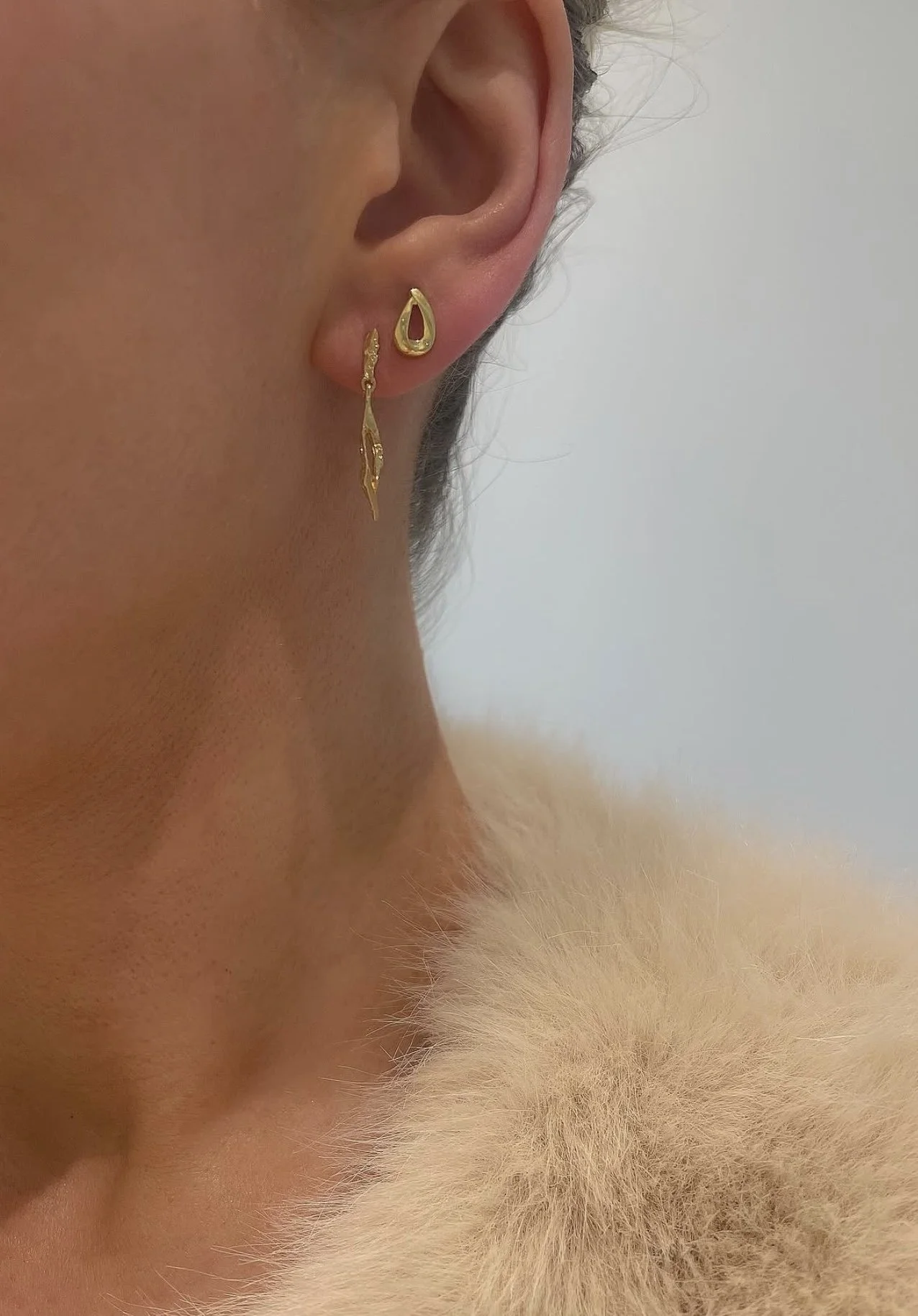 Crafted in 18k gold, these vintage drop earrings have the most beautiful elongated silhouette with an open, almost leaf-like shape that feels both organic and slightly raw. The surface catches the light in the most subtle way, giving her that quiet glow rather than a high shine… understated but so special.