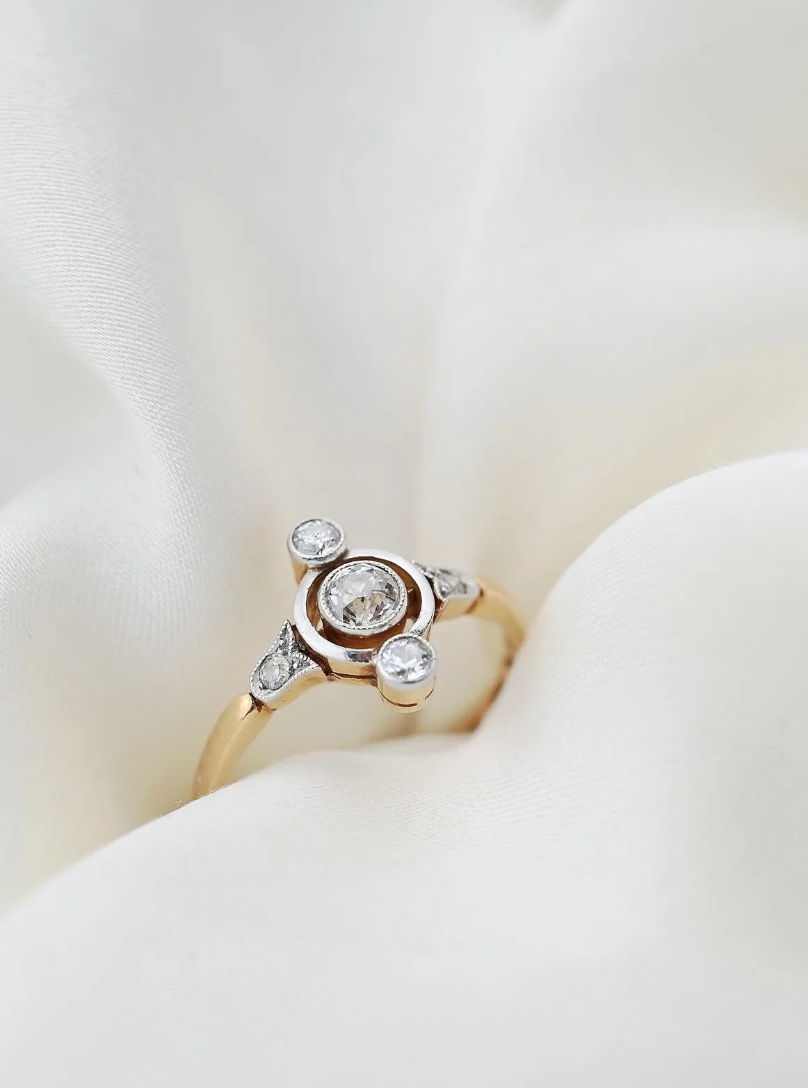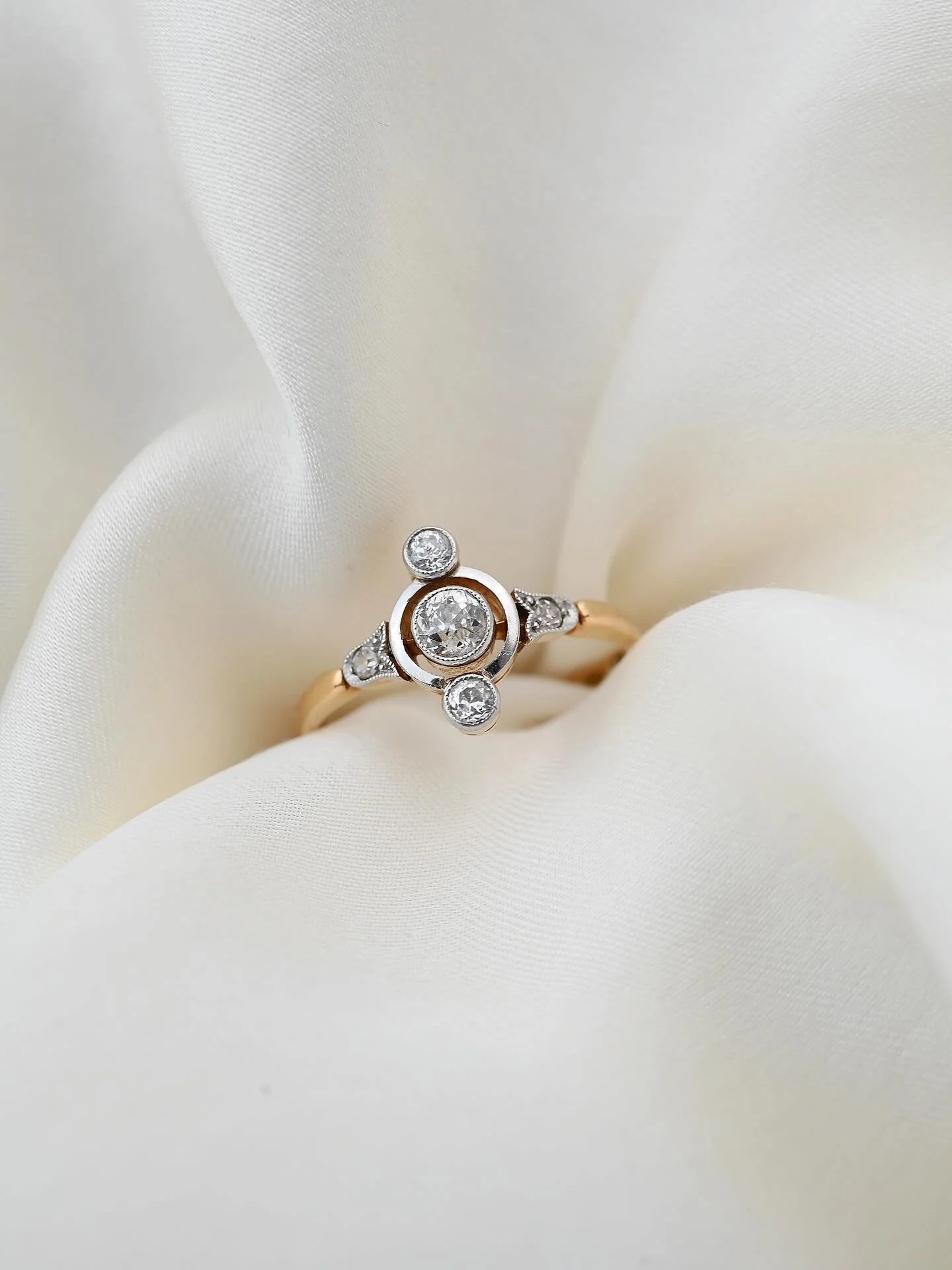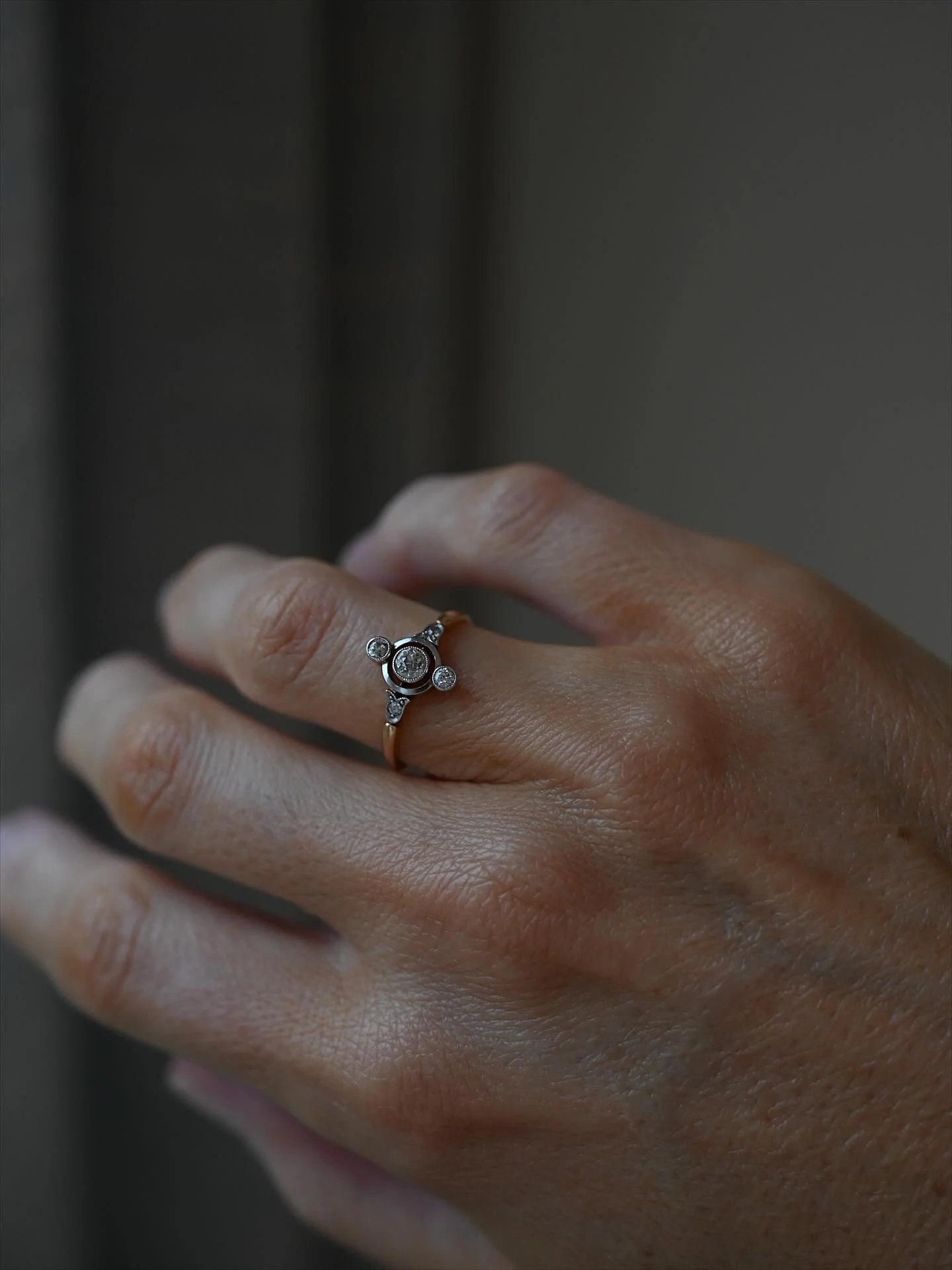 Crafted in glowing 18k gold with white gold or silver-topped settings, she holds four old-cut diamonds with that distinctive antique charm; open culets, gentle sparkle, and so much personality. The central diamond is bezel-set and framed by three additional stones, each balancing the design with elegant poise. The total carat weight is around 0.30 ct, and each stone is full of that delightful antique life.
