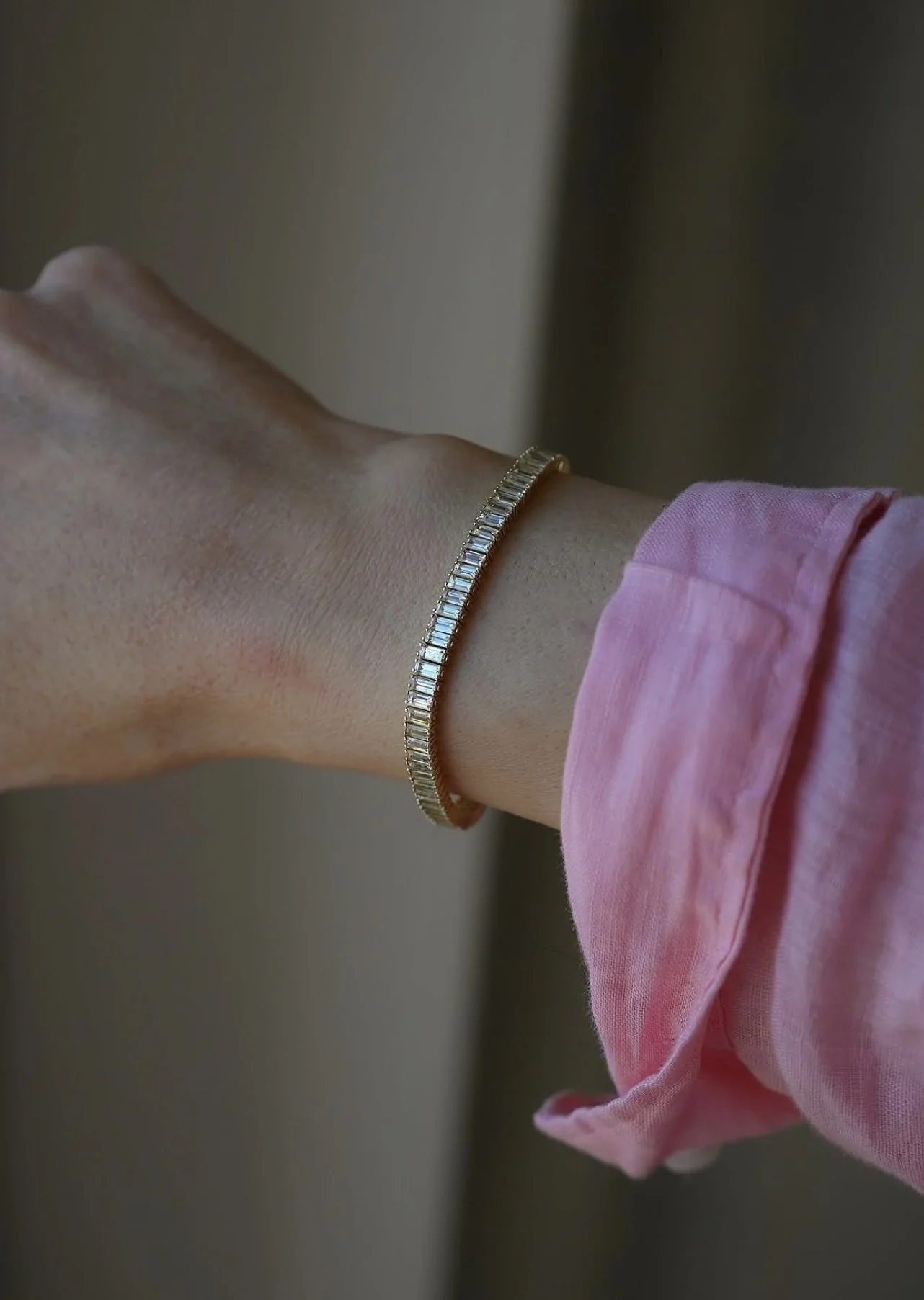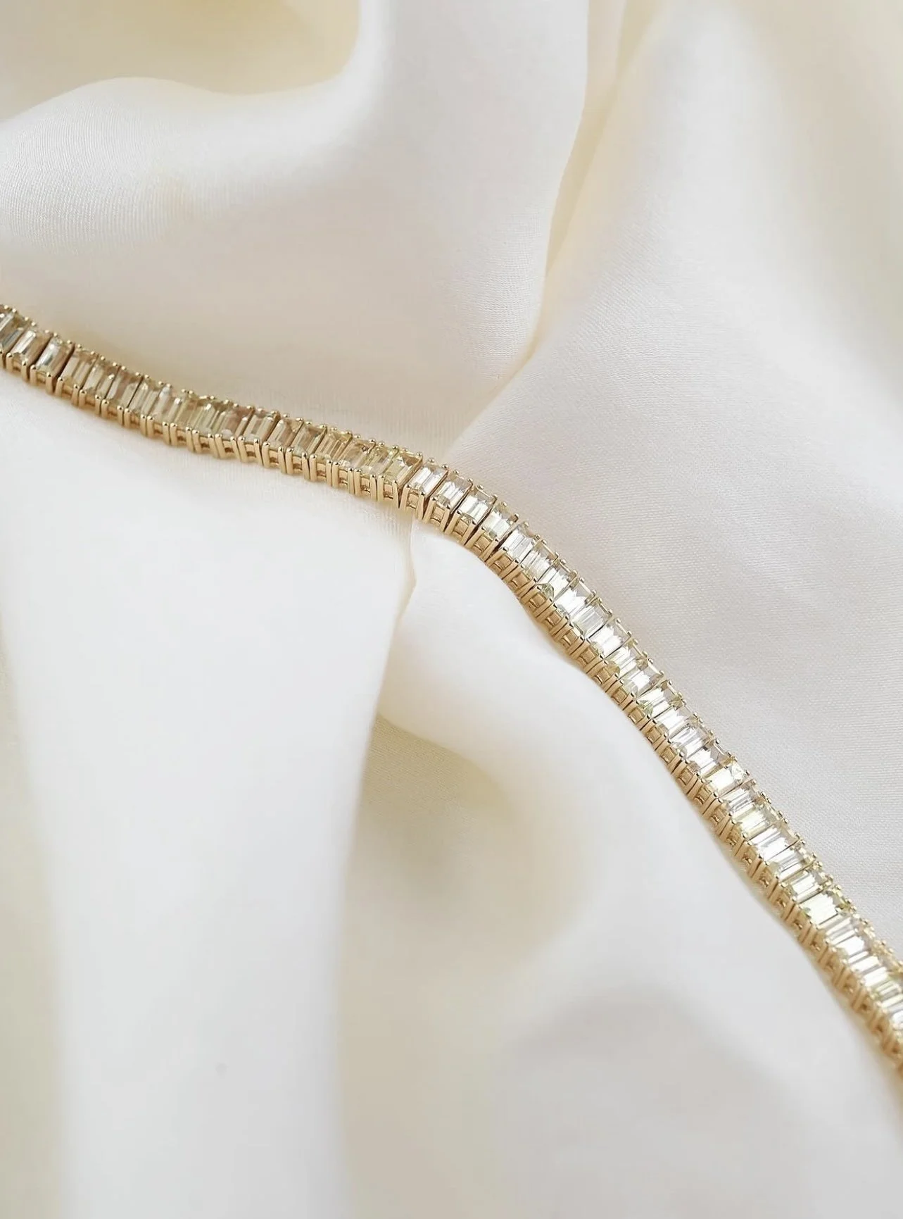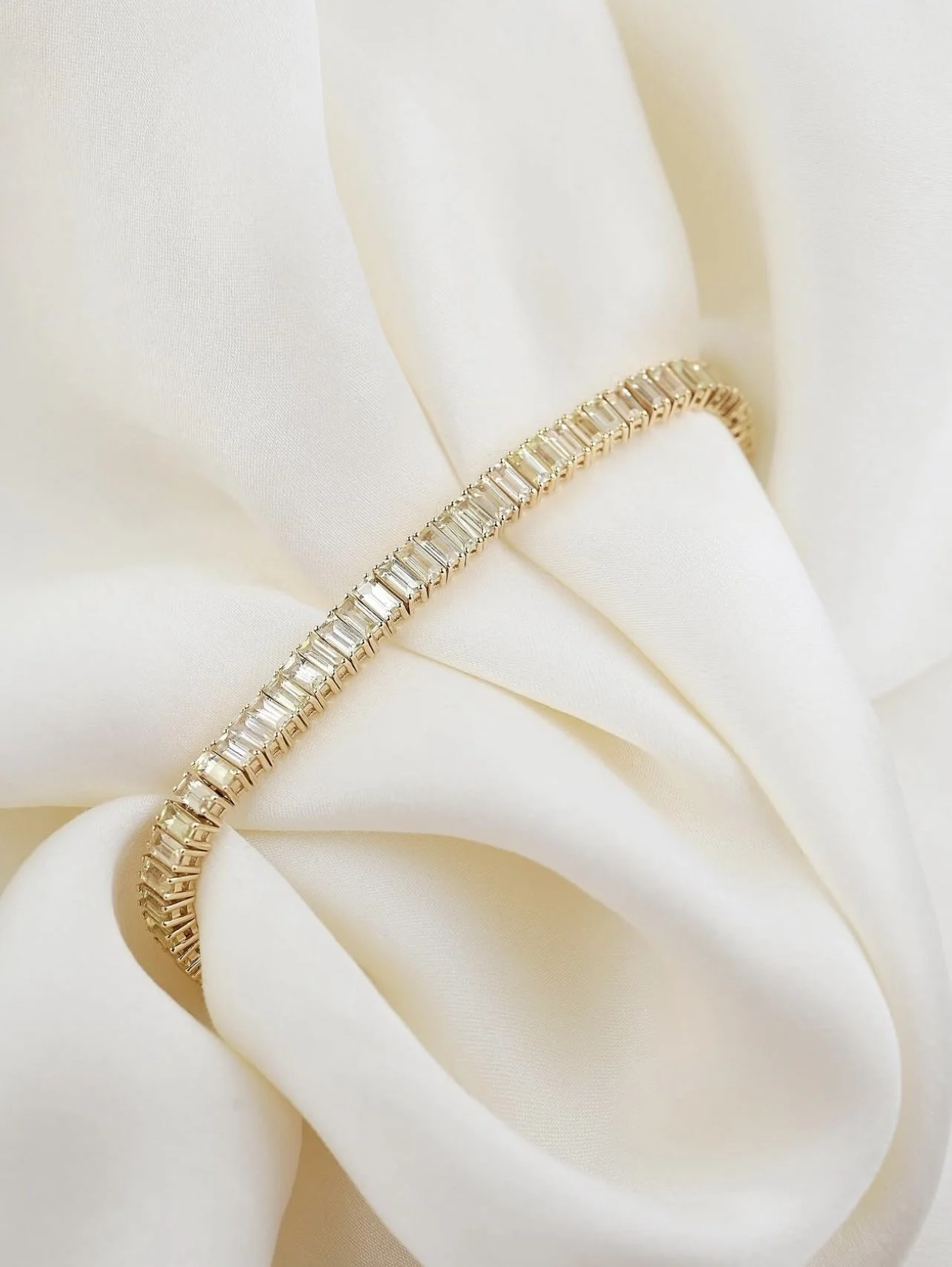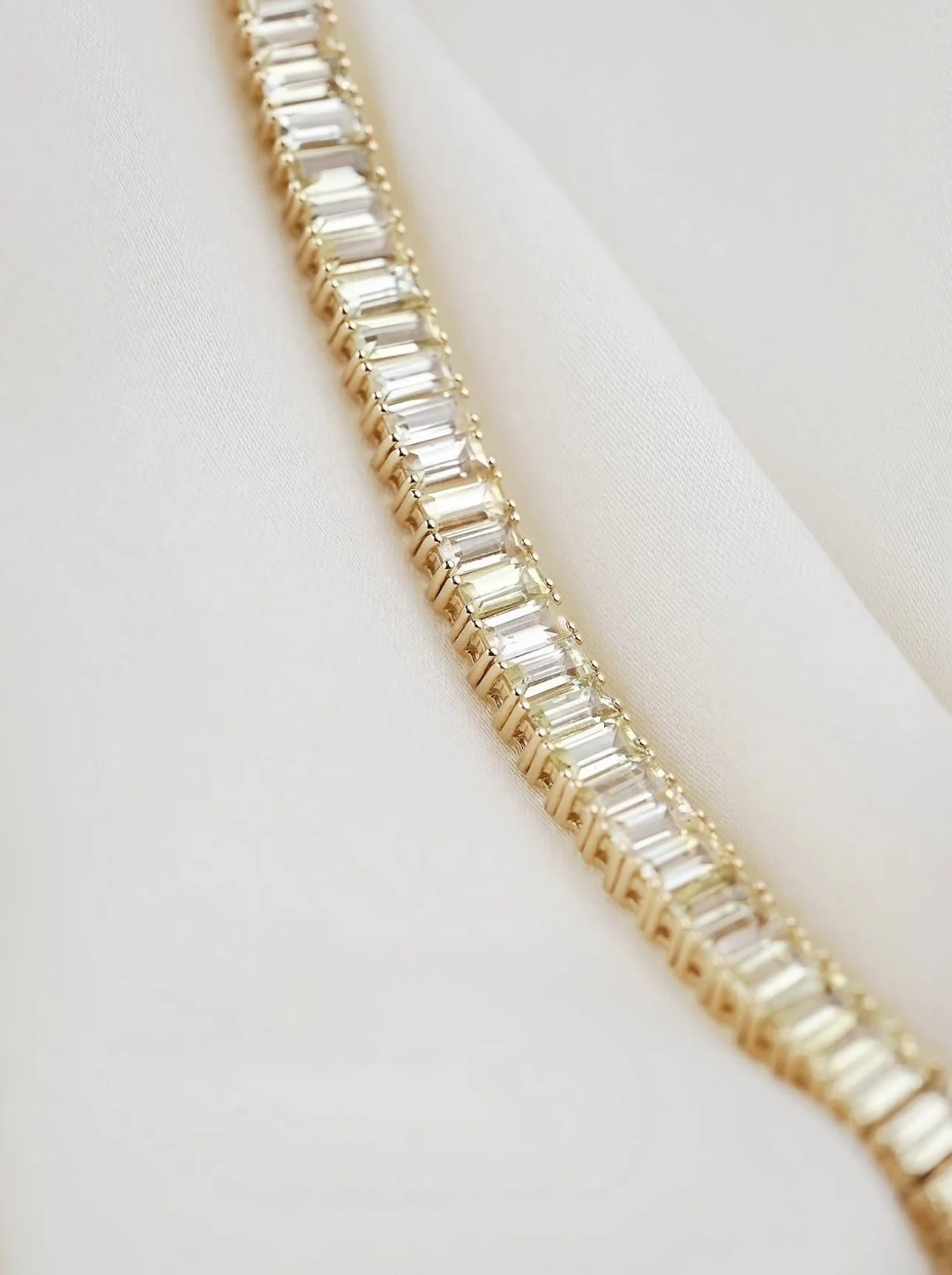 A seamless row of natural baguette-cut yellow sapphires on shopping 10.37 carats (marked on clasp), and truly… the quality here is something special. Each stone glows with this magical, luminous color that shifts between soft gold and pale champagne depending on the light. It’s not loud, it’s not harsh… it’s that quiet, almost ethereal radiance that only beautiful natural sapphires can give. All perfectly set in rich 14k gold, creating that clean, uninterrupted line that feels both powerful and impossibly refined.