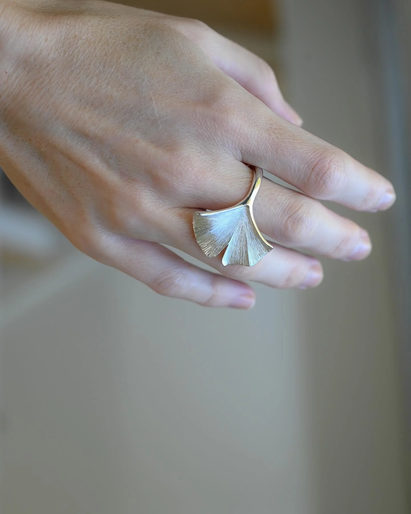 The ring is a true marvel. It wraps the finger with gentle power, its open-ended design shaped to be squeezed together for the perfect fit. Currently a size 8, she can easily adjust without any cutting. A symbol of adaptability and strength - just like the ginkgo tree itself.