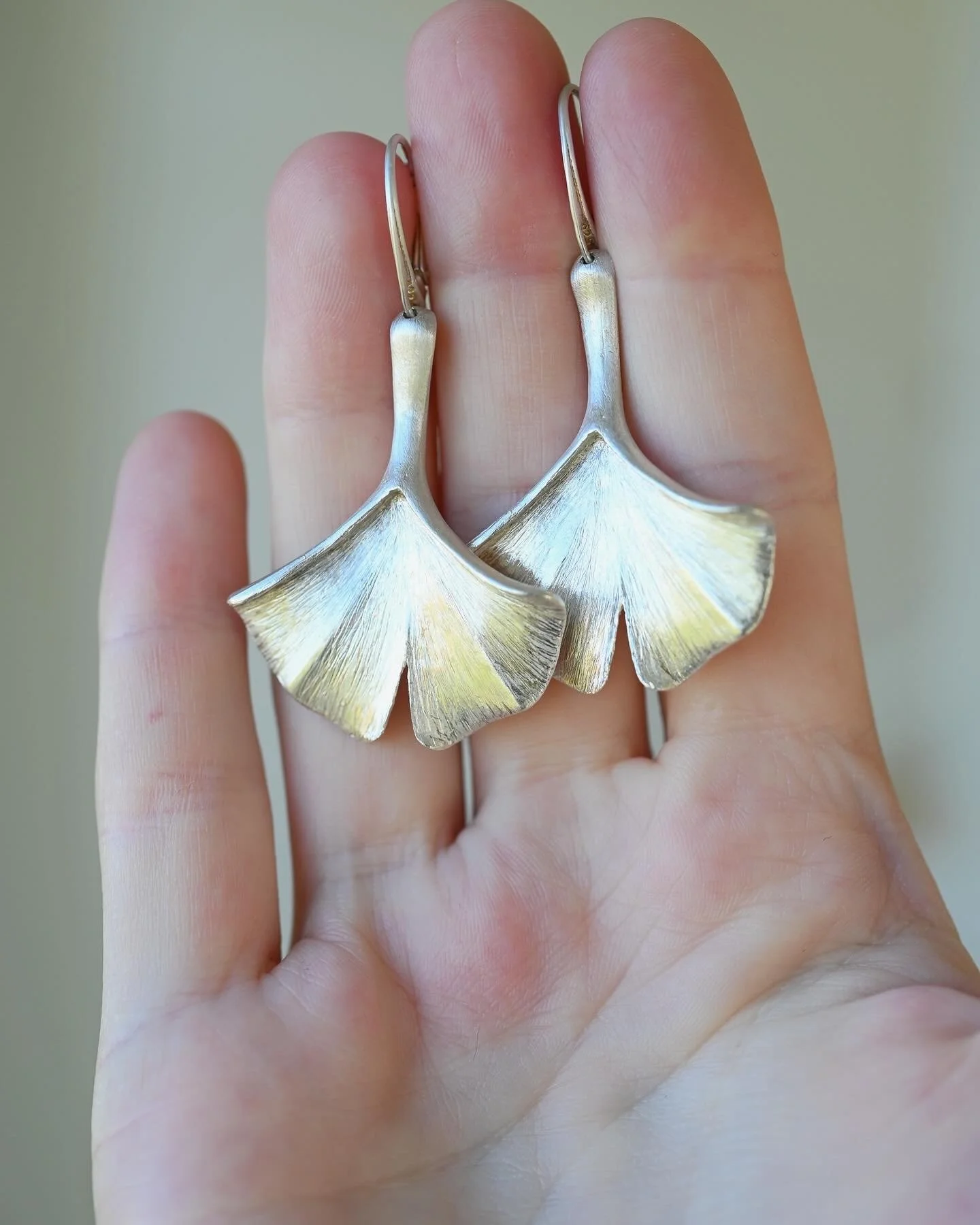 The earrings are bold and ethereal, each leaf measuring a striking 2.25 inches in length. They catch the light with every movement and frame the face with a silvery softness I didn’t know was possible.