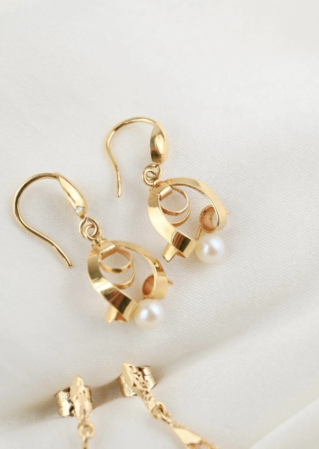 These vintage 18k gold earrings are all about their sculptural design, with those beautifully curled, ribbon-like forms wrapping around themselves in the most effortless way. There’s something almost architectural about them, yet they still feel so light and feminine. And then that tiny pearl drop… just enough to catch the light and add that soft, classic touch.