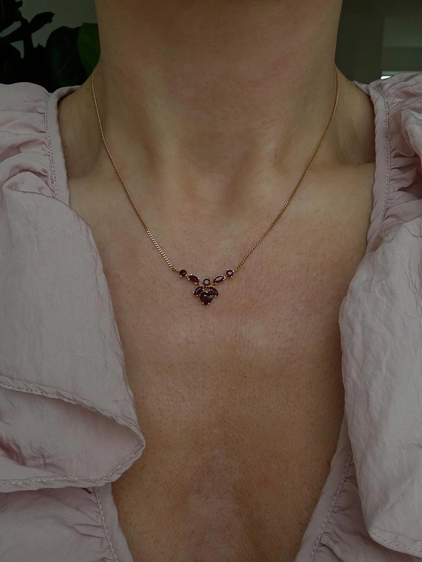 New in! Romantic Vintage Garnet Heart Cluster Pendant Chain 18K Gold