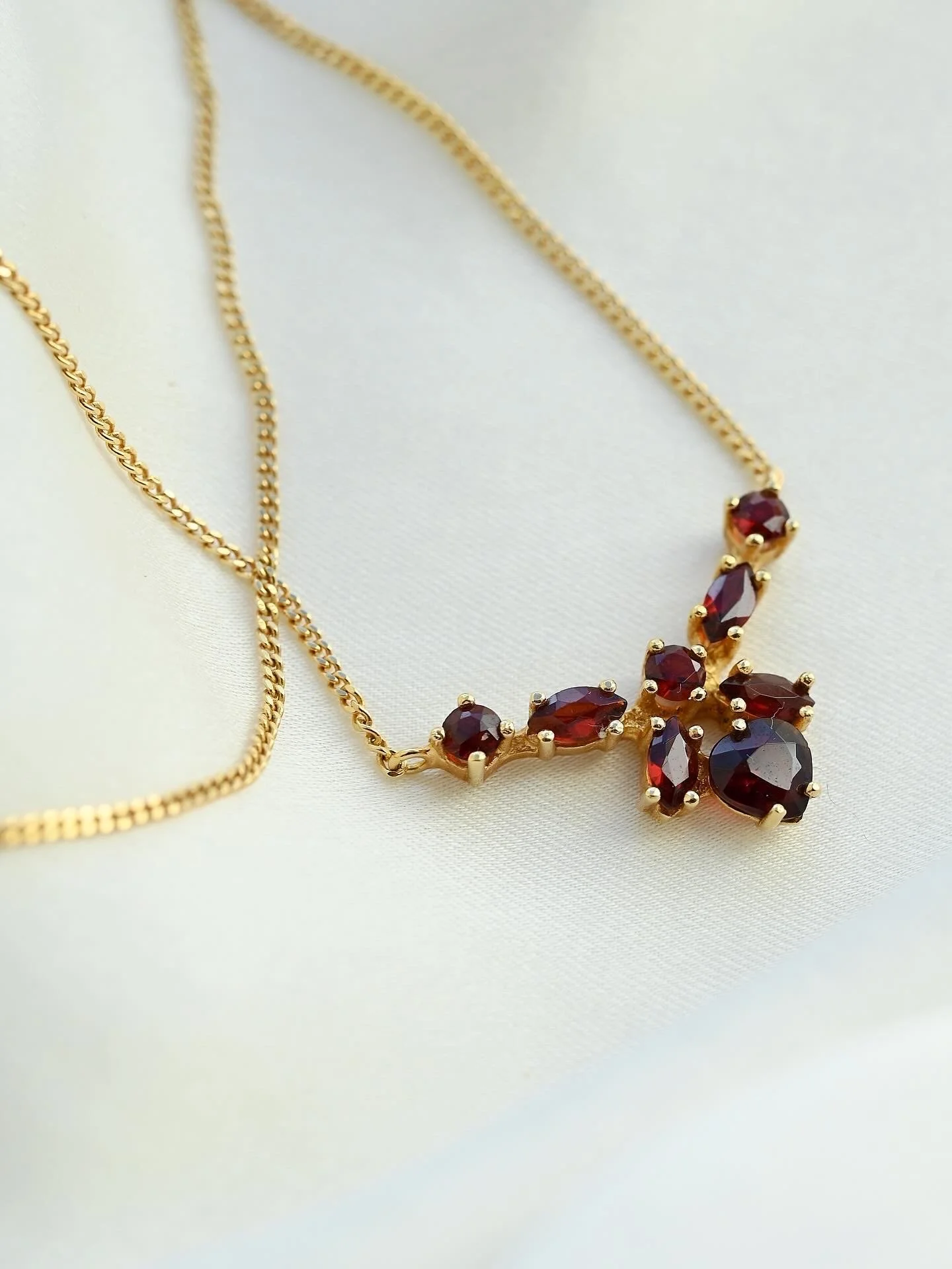 Eight faceted garnets are arranged like a blossom caught mid-bloom, their deep red glow nestled in golden claws, held delicately on a fine curb chain that you can wear in two lengths depending on your mood or neckline. At 15.25 or 16.15, she sits just where the collarbone meets the heart.