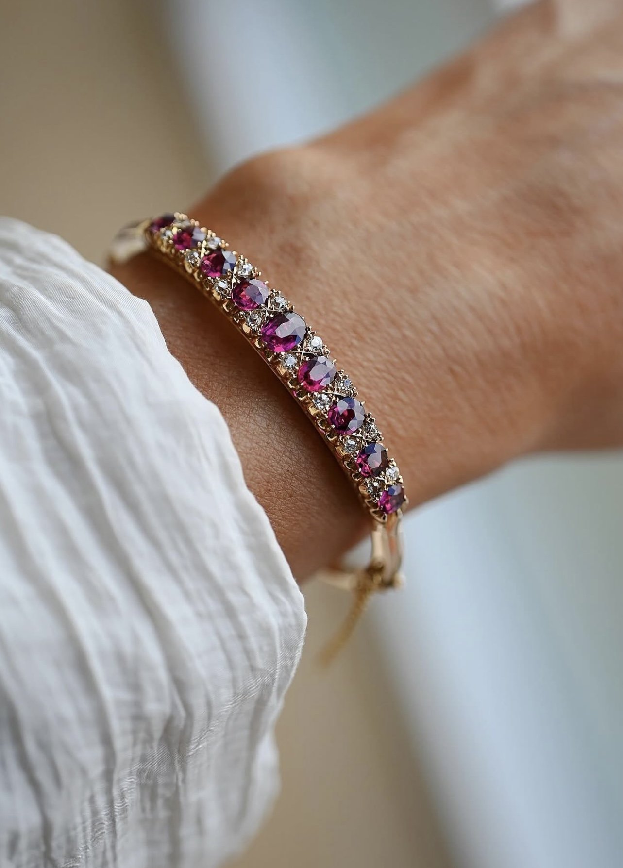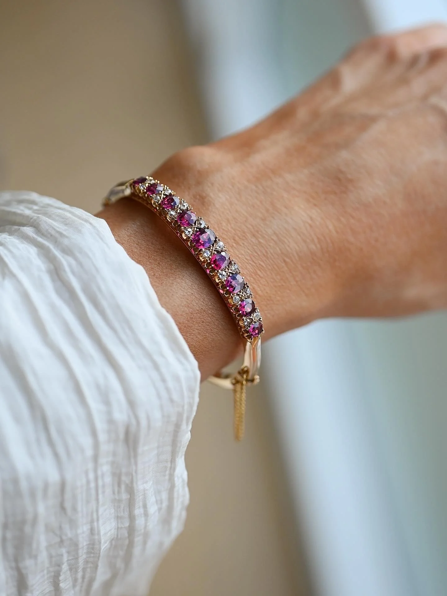 Set in solid 14K gold, she features a beautiful line of vibrant ruby stones, each one framed by delicate old-cut diamonds that shimmer softly with every movement. The combination of that deep pink-red hue against the warm gold is just magic… romantic, timeless, and so striking on the wrist.