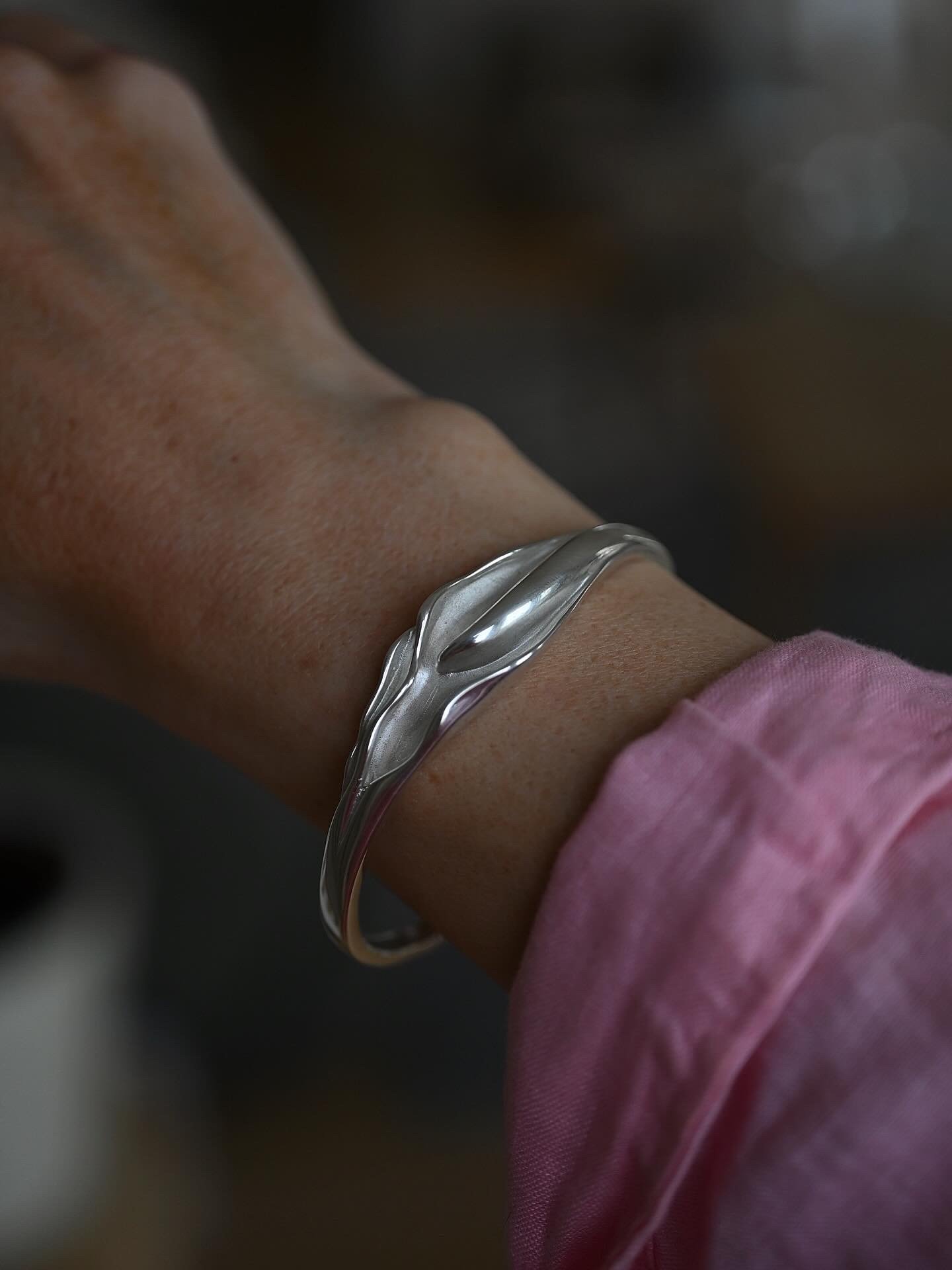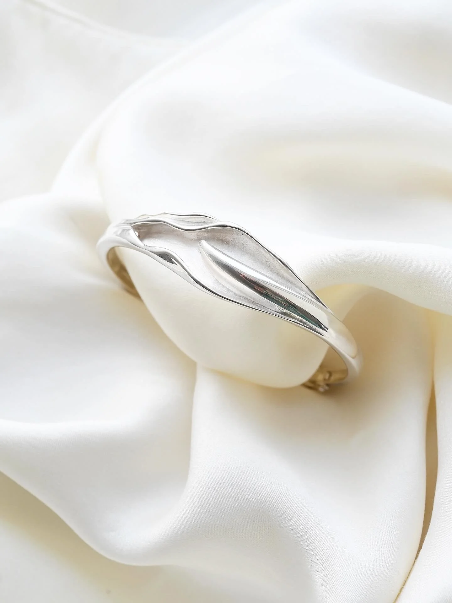 Crafted in sterling silver with that smooth, mirror-like finish, she wraps beautifully around the wrist with an elegant, slightly bold presence. The inside circumference measures approximately 6.5 inches, giving her that perfect, close and sculptural fit.