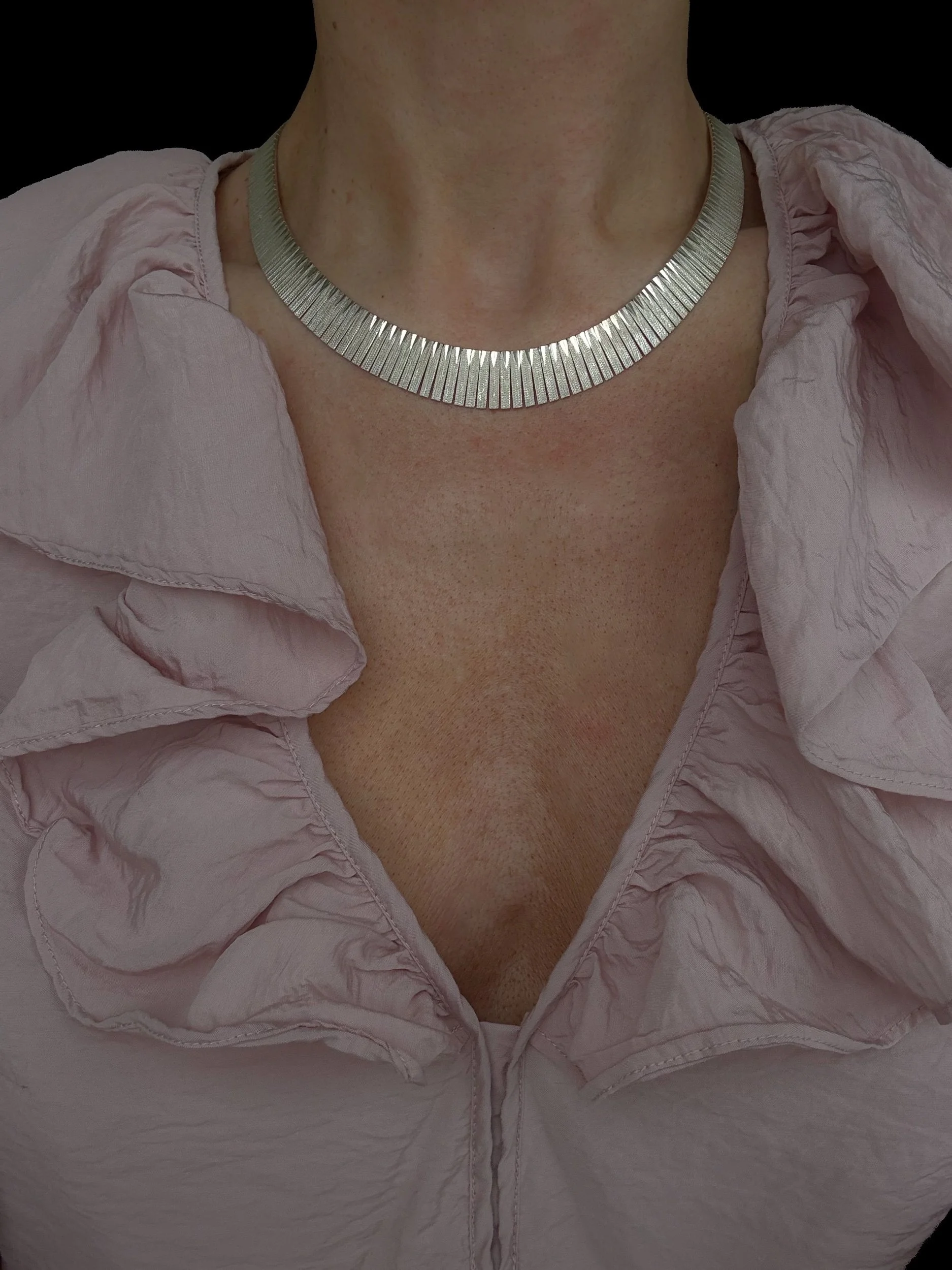 Crafted in bright silver with a beautifully tapered silhouette, she rests with presence and elegance, drawing the eye without ever shouting for attention. Measuring around 16.5 inches, she hugs the neckline like she was made just for you. At her widest, she spans 15 mm, adding boldness to her classic lines. The clasp clicks into place securely with a satisfying snap, and she has a subtle texture that makes her feel alive with history.