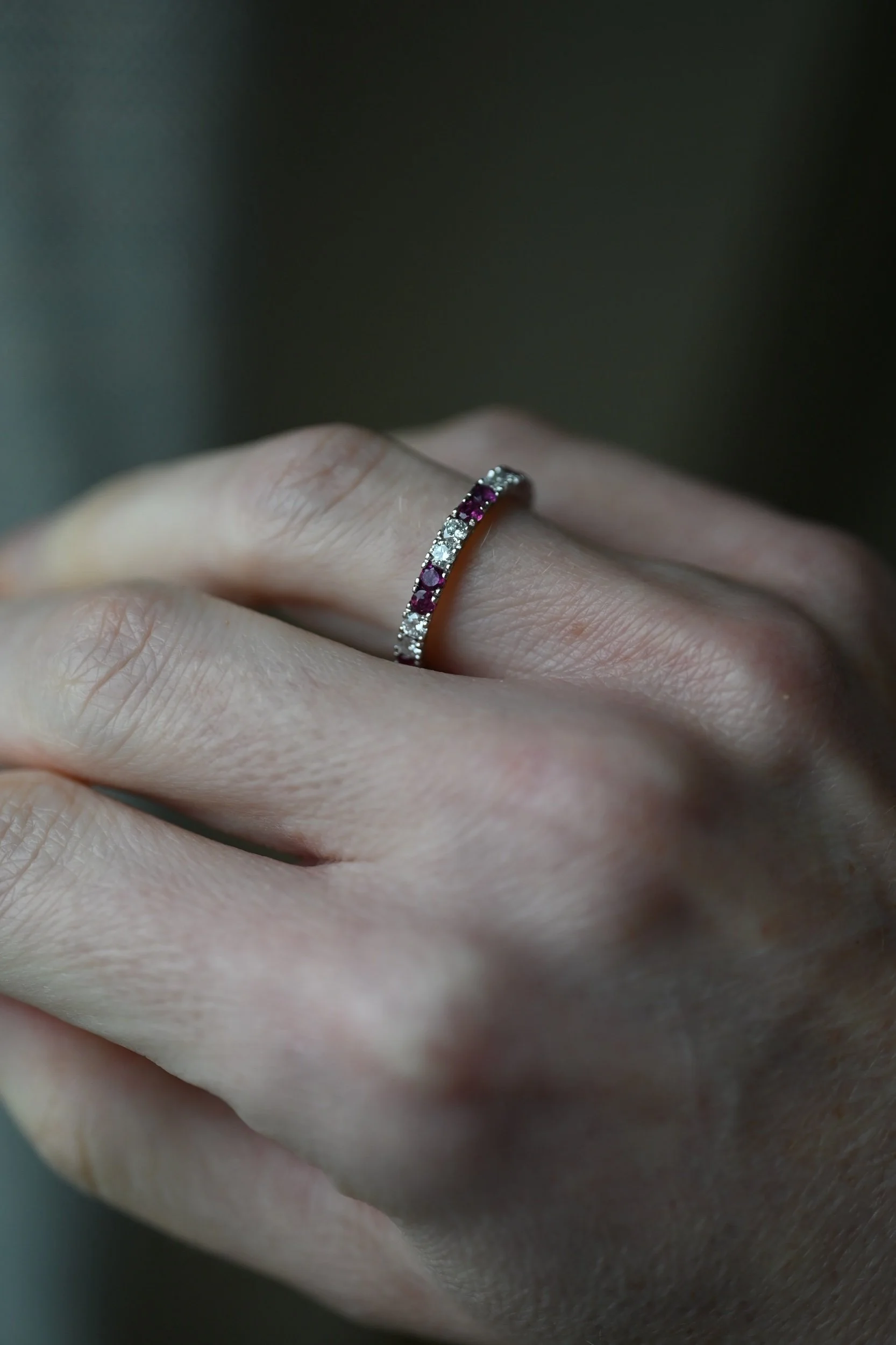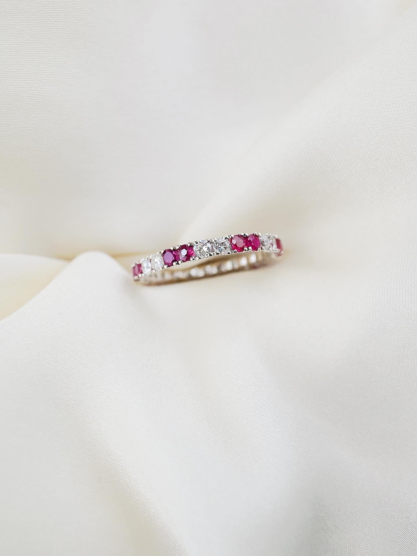 A fine 18k white gold band set with brilliant cut diamonds and vivid faceted rubies, creating that irresistible contrast between icy sparkle and rich, saturated pink tones. She catches the light in the most playful way, shifting between soft shimmer and flashes of color with every movement.