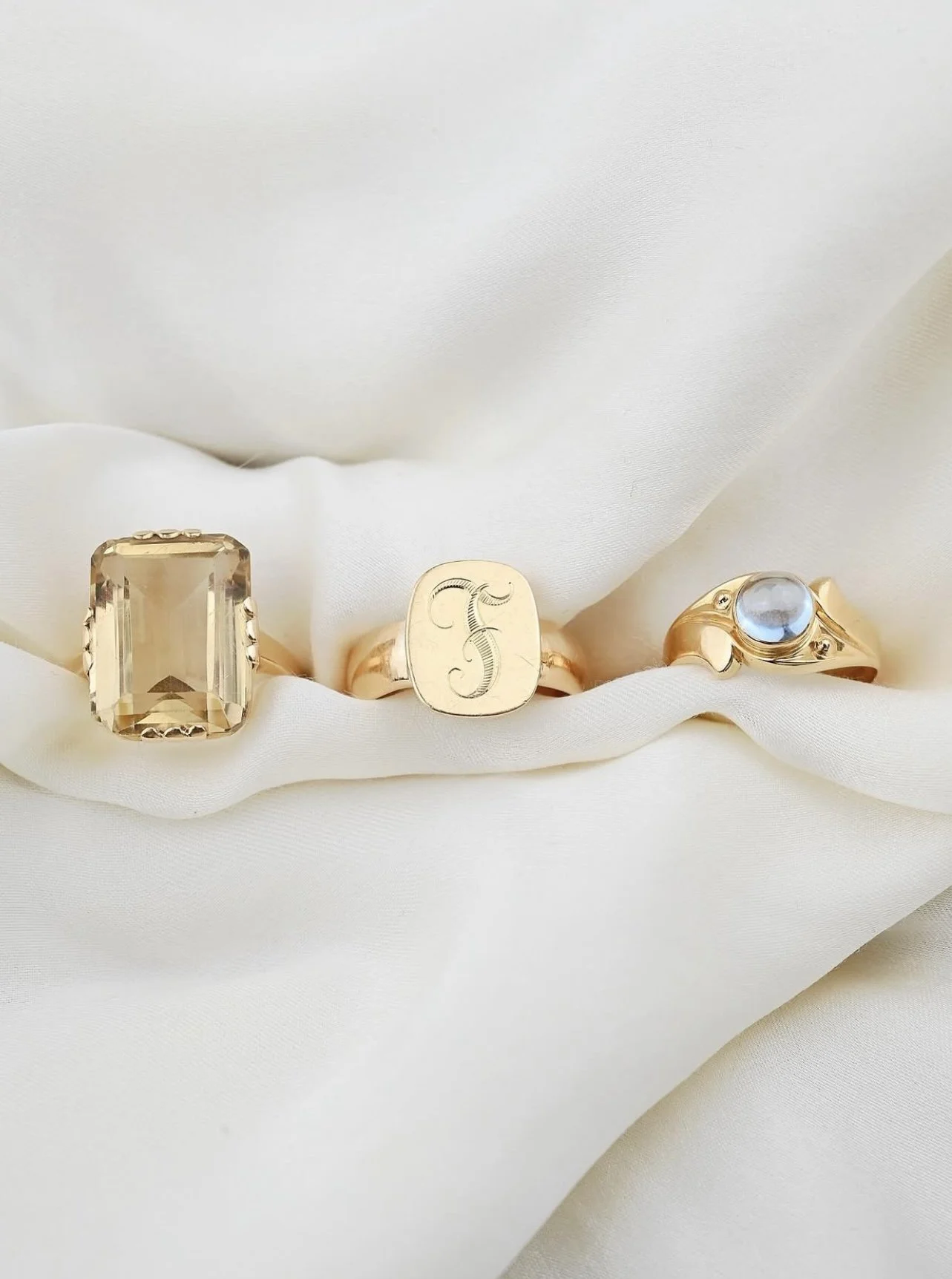 She’s the dreamiest little Scandinavian piece! This 18k gold ring was crafted in 1964, and set with a pale blue cabochon-cut spinel that absolutely glows in the light. Her silhouette is smooth and sculptural, with flared shoulders that cradle the soft dome of the stone like a drop of water about to slip from a petal.