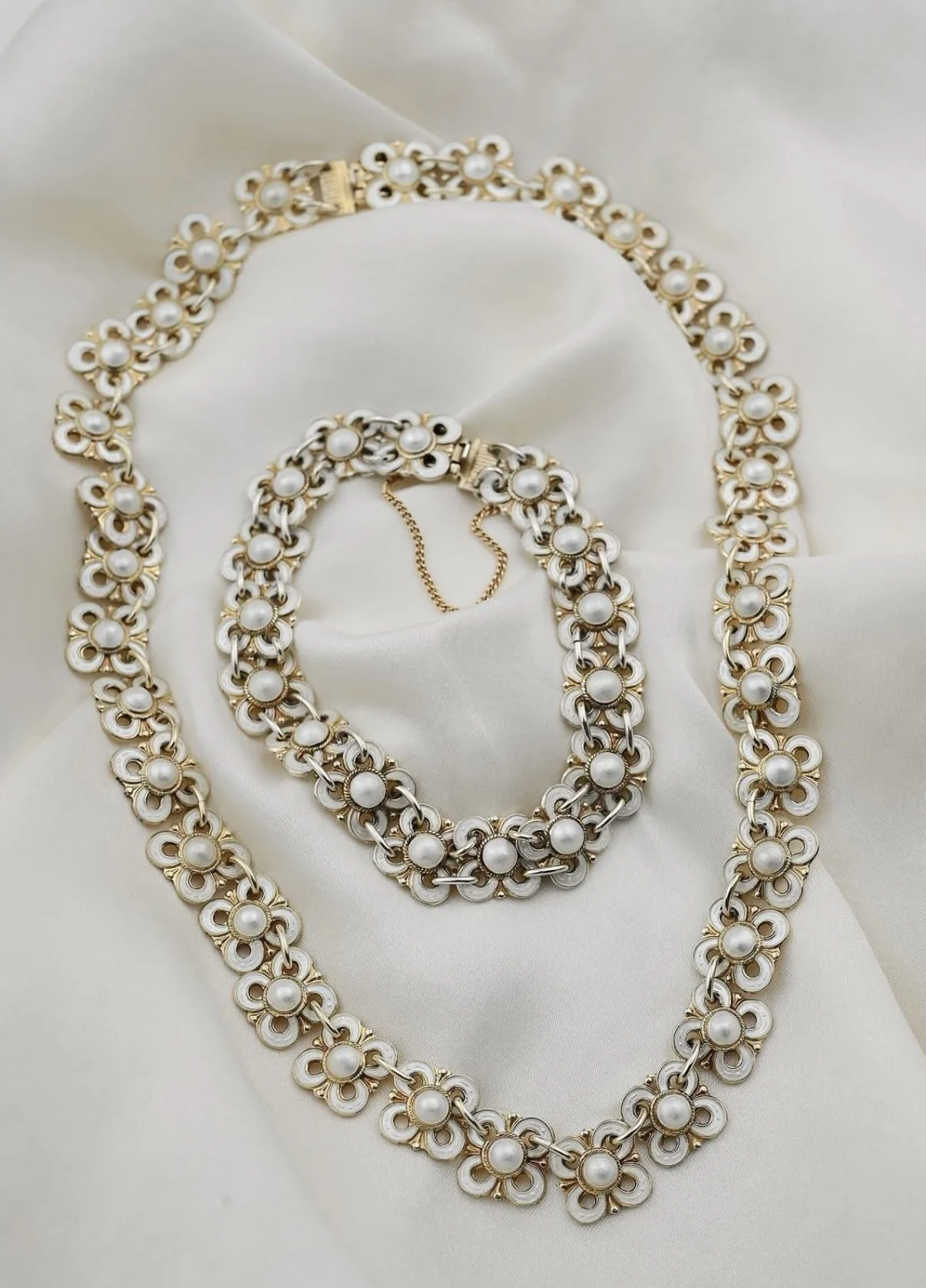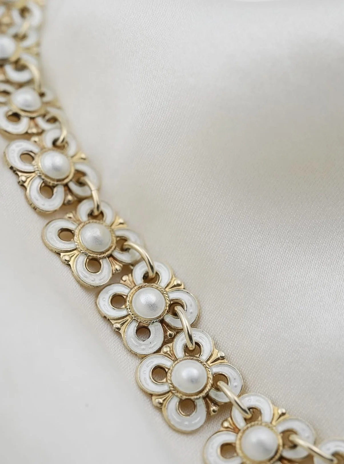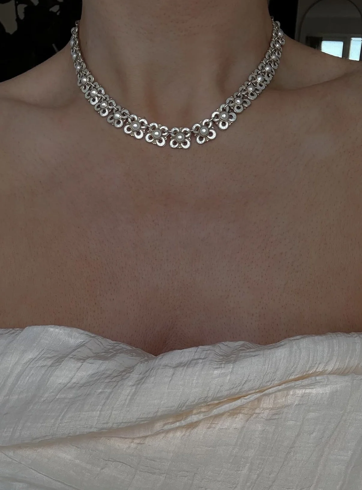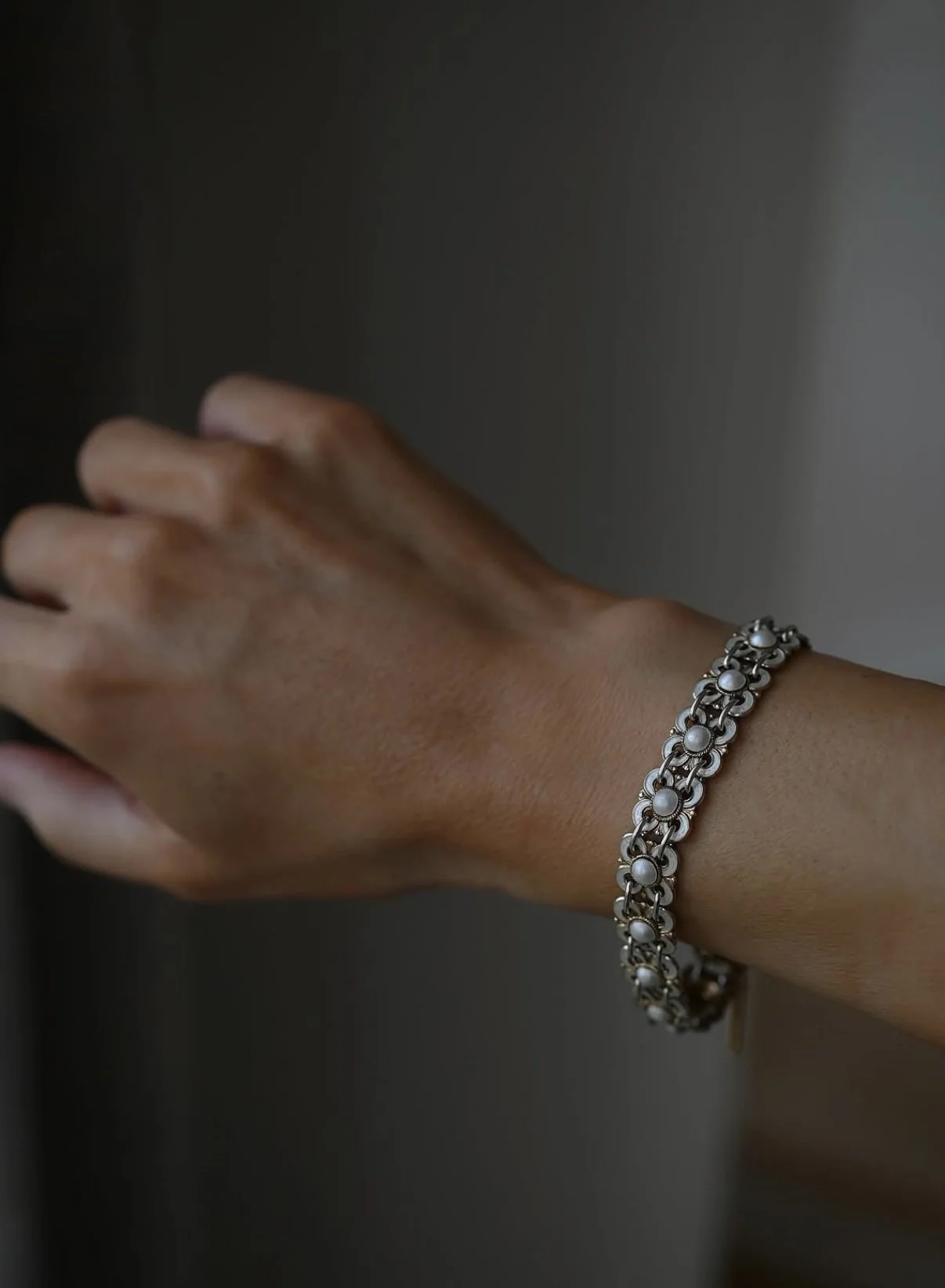 The links are wide, tactile, and visually rich with their geometric “x” forms. She has just the right weight for a satisfying drape on the wrist, sitting securely with a box clasp and double safety eights. You can perfectly wear her worn solo and stacked - she plays well with others but easily holds her own.