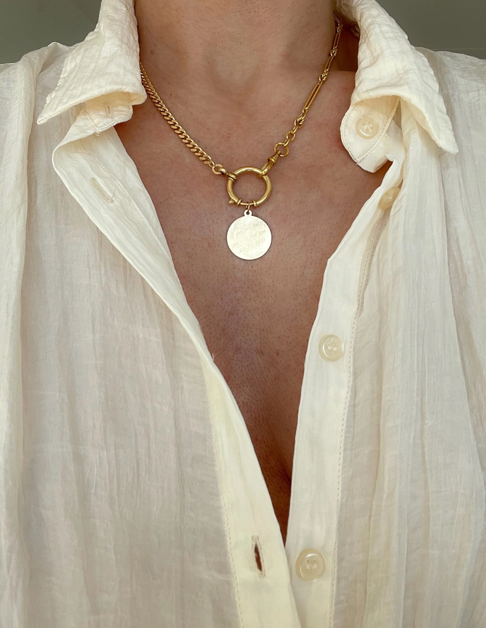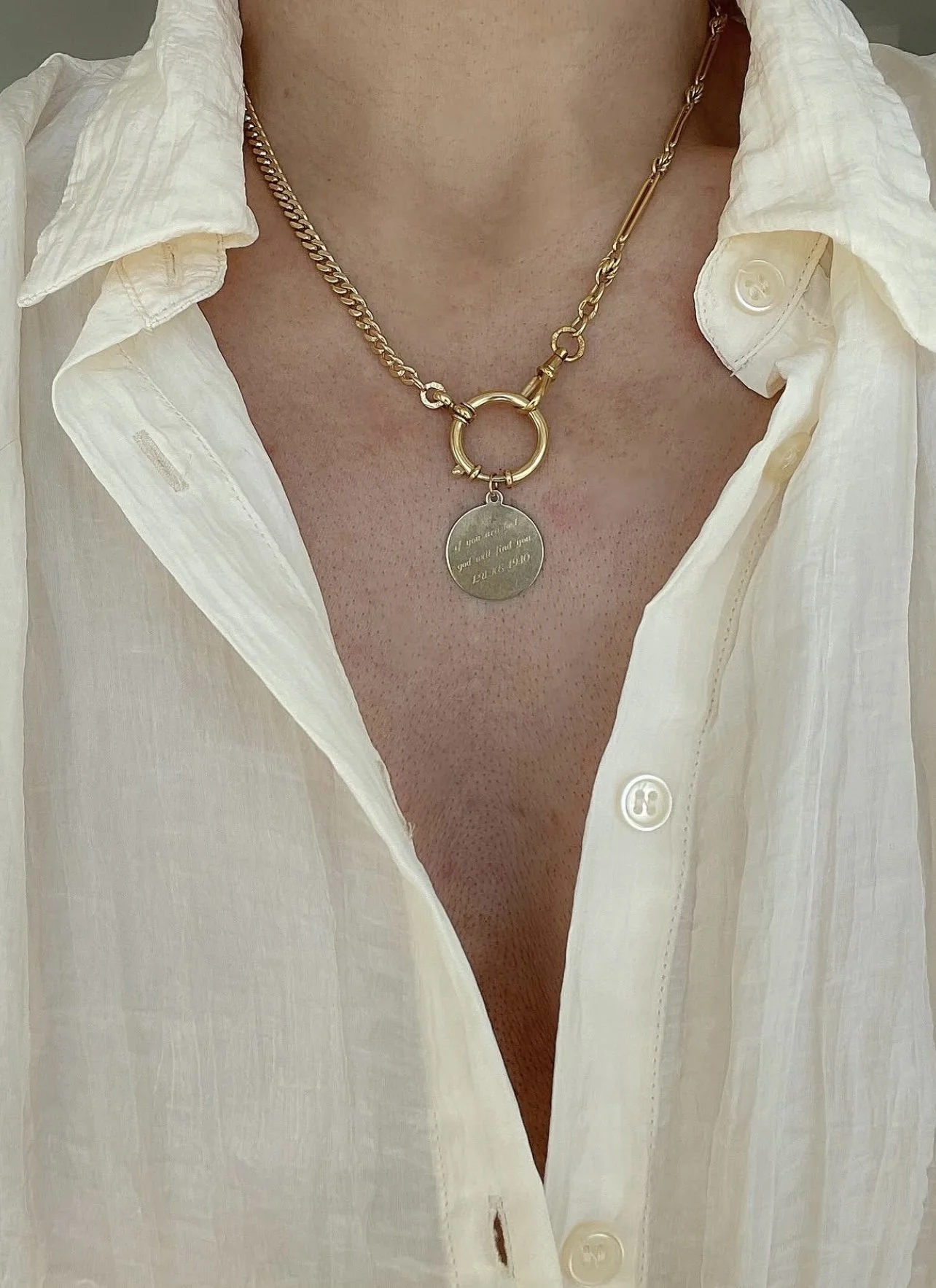 An antique 18k gold watch chain, beautifully crafted in Stockholm in the 1900s, featuring those rich, structured armour links that give her both strength and elegance. She has that perfect balance between utility and beauty… originally made with purpose, now effortlessly transformed into something incredibly versatile and modern.