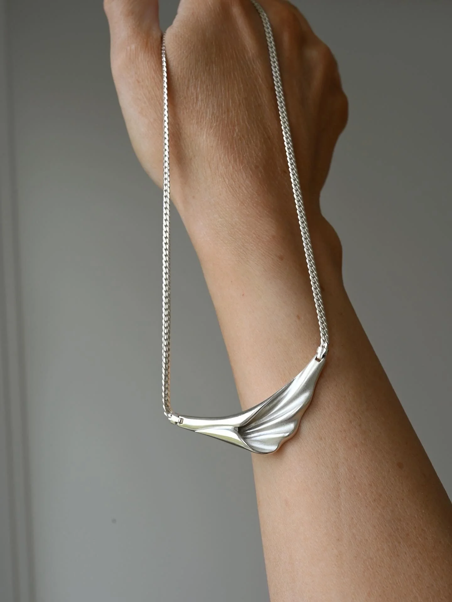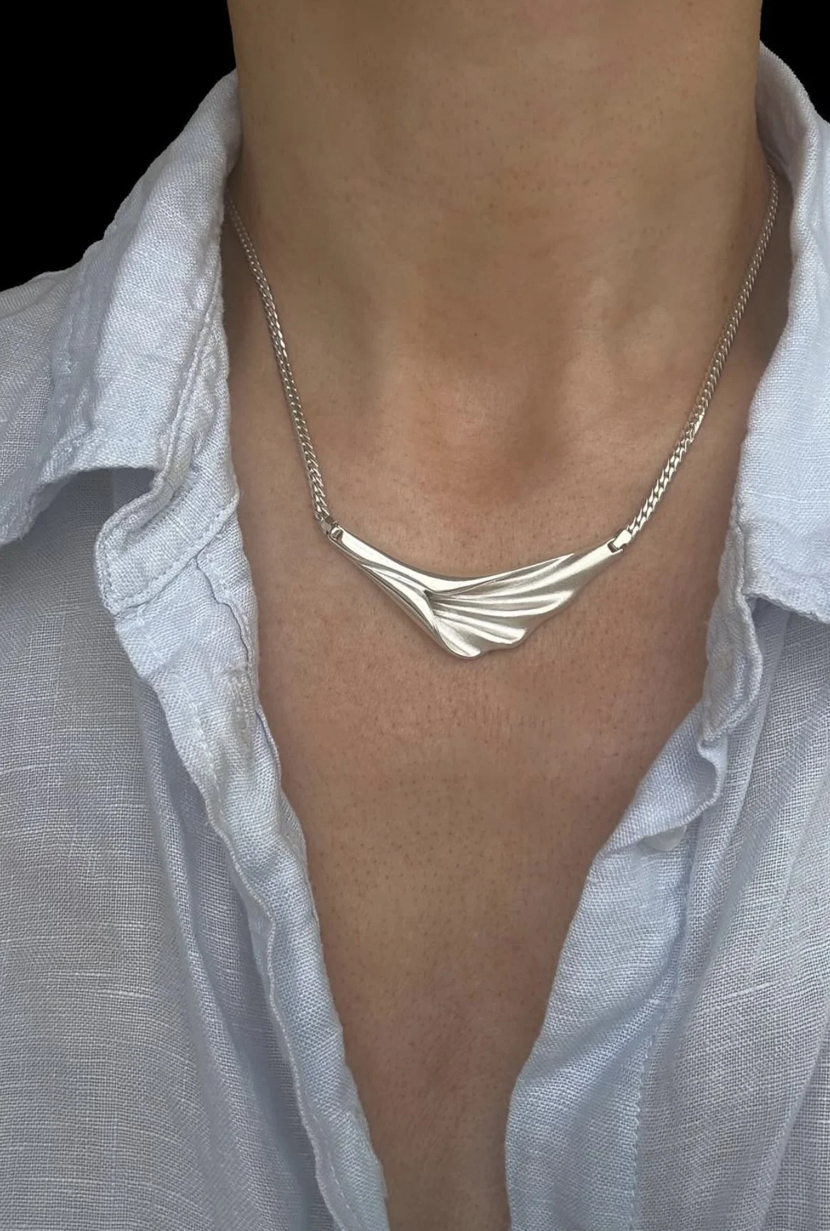 Here she is, and she is nothing short of sculptural!!! A beautifully fluid sterling silver necklace that hugs the collarbone with such grace, it almost looks like it’s flowing. The centrepiece is an elegant lily flower swirl, softly folded like fabric mid-motion, and anchored by two solid box chains on each side. She’s understated but undeniably bold, the kind of piece that doesn’t shout for attention, but always gets it anyway.
