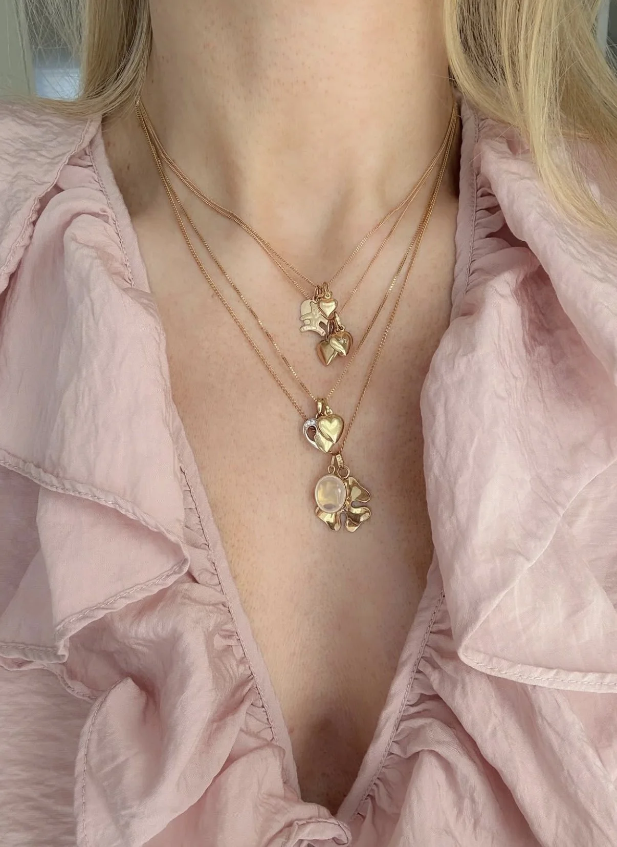 All are solid 18k gold and sold separately. Choose one, build a pair, or create a whole story across your neck. They layer like a dream, as you can see.